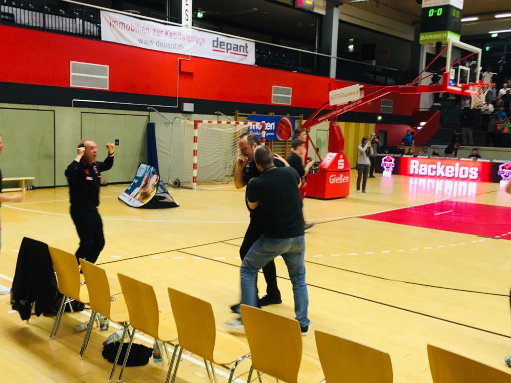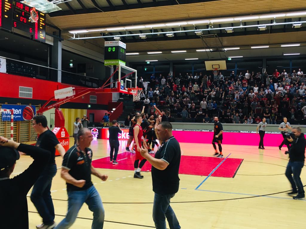 The overtime was thrilling that saw five lead changes as both teams knew that their seasons were on the line. Lischka began with a lay in giving Giessen the 92-90 lead. Then it was Alexis again nailing a trey giving the wiha Panthers Schwenningen their first lead of the game. Some fans may have thought better late than never. Alexis came into the game shooting 5/20 from outside at 20% and would finish with the biggest game of his life with his Pro B break out with 19 points and six rebounds while shooting 60% from the field. “Anell was fantastic tonight. He was so aggressive and shot the ball so well all week in practice. We were confident that he would shoot the ball well. When you get contribution like that it makes everything so else easier”, warned Rasheed Moore. Then Lischka gave Giessen the lead back until Moore made a lay in for the 95-94 lead. Then seemed to come the turning point of the game as Giessen got back to back buckets from German Leon Okpara who on both plays was standing perfectly and got two loose balls for easy buckets and was like German legend Gerd Mueller back in the day who always stood in the right place making hundreds of goals in the German football Bundesliga. Giessen was up again 98-95. The wiha Panthers Schwenningen then were benefited by seeing Pjanic and Williams get their fifth fouls. The wiha Panthers Schwenningen then got two stops as Moore made free throws tying the game at 98-98. Kraushaar then made free throws for the 100-98 lead and Moore then made only one of two free throws to cut the Giessen lead to 100-99. Even if Alexis was one of the big hero´s of the game, so was Bill Borekambi. He saved his best for last. He made a huge block with 14 seconds and then scored the winning shot with 4 seconds to play. “Bill´s shot looked like he shot the ball 30 feet in the air and it dropped in. He makes shots like that all the time. We see it in practice every day. He finds ways to make difficult shots all the time. I have to compliment his hard work that he puts in so he can make a shot like that”, stressed Rasheed Moore. Giessen had one last attempt to win the game, but Thomas Tshikaya´s shot to win the game fell short. “The ball fell in to Okpara´s lap twice, but those things happen. We fought through it and found a way to win it at the end”, stressed Rasheed Moore. “We stayed strong at first, but got a little tired at the end. They capitalized on rebounds and our mistakes”, added Jordan Williams. The wiha Panthers Schwenningen were led by Rasheed Moore and Anell Alexis with 19 points a piece. Bill Borekambi added 18 points and Sergey Tsvetkov dropped 15 points while Giessen was led by Johannes Lischka with 17 points. Jordan Williams added 17 points and Bjarne Kraushaar had 15 points an d9 dimes. The German trio of Alen Pjanic, Tim Koepple and Leon Okpara combined for 33 points. The wiha Panthers Schwenningen shot 54% from the field and 45% from outside and got 41 rebounds and had 14 turnovers while Giessen shotb47% from the field and 28% from outside and got 32 rebounds and had 7 turnovers.