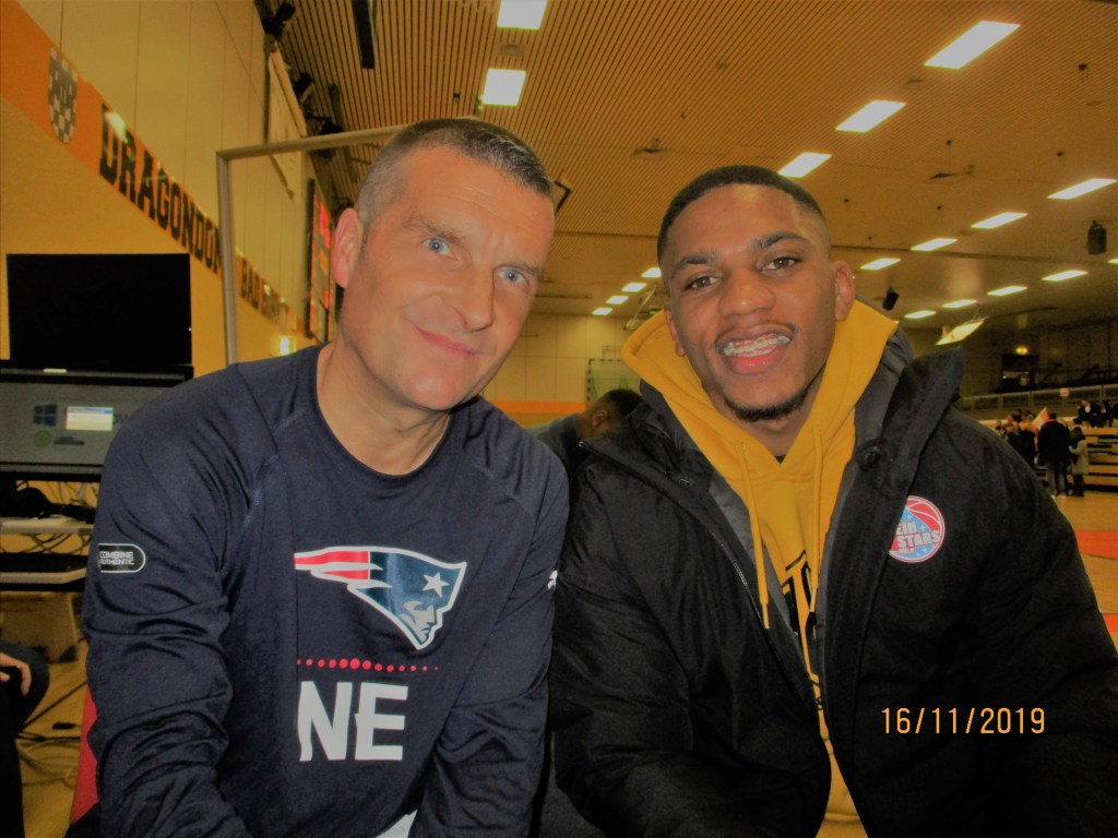 It was a rather mild Saturday evening in Bad Honnef in mid October that was wrapped up with bands of showers that brought in the fog at times, but in the Dragon Dome there was no rain, but offensive power from the Regionalliga team Dragons Rhondorf who were taking on the Hertener Lowen and had a very comfortable 51-36 advantage at the break. This was a type of lead that they hadn´t seen since the Kameron Taylor days where basketball life was enjoyable in Dragon land. I was doing play by play and during half-time, I always look for some player who happens to be at the game for a quick quote for my post game article about the play on the court. There were no Telekom Baskets Bonn players present, but then I saw a young man who looked familiar. Then I remembered that that was Karl Dia who played in Rhondorf the last two seasons. He had left a positive impression as he was greeted nicely by fans who recognized him. Now he is playing for the RheinStars Cologne and had only a 20-30 minute drive to the game. He gave me some input about the first half and then I saw that he was there with another guy who had to be a basketball player. I asked Dia if that was Vincent Golson. Dia responded with yes. This was another encounter that I have had often with players where I had dealings with them in the past usually with an interview, but didn´t actually do it in person. I had interviewed Golson over the summer and now was able to meet him for the first time. We had a very nice chat and I asked him if he was actually playing for their second team, because I never saw him in the stat sheet of the Regionalliga team. He said that he had been hampered by an injury, but was back and ready to play. I knew that I would see him play Live soon when he and his team visited Rhondorf. I love using nicknames in my play by play as with the Dragons team, I have some fancy nicknames for the players like “easy work” for Curtis Hollis, “the fountain of youth” for Anish Sharda or the “glue guy” for Killian Binapfel. Then I remembered that he also had a unique nickname given to him by his mom. His mother had called him two two as a kid, and I kidded around with the American about being called three three if his trey explodes during his rookie season in Germany. “I think the fans will have to double up on my nickname with all these four point plays I’m about to make this upcoming season! But if I do have a recording breaking season I will wear #33 from there on out for three three”, smiled Vince Golson. The American like almost every player definitely wasn´t lacking in self confidence.