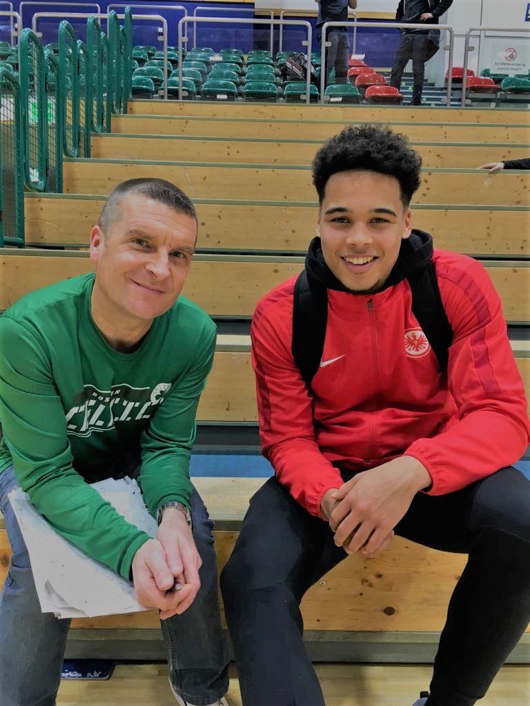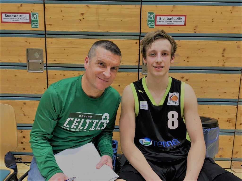 The turning point of the contest occurred in the third quarter as Eintracht Frankfurt-Fraport Skyliners got going quickly getting the lead into double digits and never looked back. Eintracht Frankfurt-Fraport Skyliners began with a quick 11-3 run to extend their lead to 64-55. Eintracht Frankfurt-Fraport Skyliners did a good job attacking inside and taking advantage of the mis matches. Begue began with a hook shot, Vasiljevic scored in the paint, Steinfeld hit free throws, Fischbach made a steal and lay in on the coast to coast sprint and Schaum connected on a trey. Eintracht Frankfurt-Fraport Skyliners finally was putting it together consistently at both ends of the court. Especially on defense, they upped their intensity which led to easy baskets on offense. Eintracht Frankfurt-Fraport Skyliners continued to play the Tenent Young Hero´s very tough continuing to defend well and banging the ball inside. Steinfeld who at age 18 is playing his first NBBL season after living 2 years in the States has made a good transition back to Germany and came up big with a block and scored 3 times as Frankfurt led comfortably 74-60. Eintracht Frankfurt-Fraport Skyliners had control of the game with good ball movement and decision making and were defending Wenzl tougher as he couldn´t make any more shots while Feneberg had to take up more responsibility. Down the stretch of the third quarter, the Tennet Young Hero´s got some clutch three´s from 16 year old Florian Kaempf who´s grandfather is the well known German coach Georg Kaempf and 18 year old Lukas Pryszcz to keep them in striking distance, but Vasiljevic closed out the third frame with an offensive rebound and put back for the 79-66 Frankfurt lead. “We began to play more inside as they had no height to defend us. We also took advantage of the many mismatches”, added Maxie Begue. “We lost energy. Their posting up hurt us as well. Their big men are good passers and had the ability to make the kick out passes to the shooters”, stressed Nico Wenzl.. Eintracht Frankfurt-Fraport Skyliners shot 64% from the field and 30% from the parking lot and had 30 rebounds and 10 turnovers while the Tenent Young hero´s shot 42% form the field and 46% from the parking lot and had 21 rebounds and 9 turnovers.