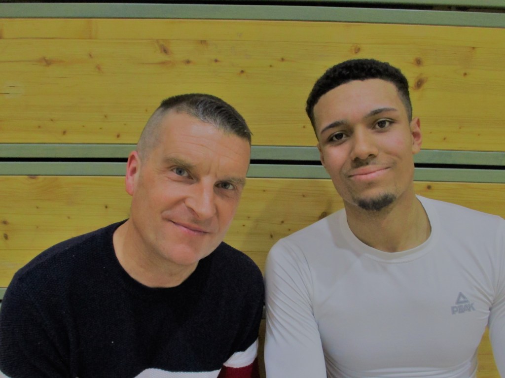 Miles Schmidt-Scheuber interviewing Len Schoormann who led all scorers with 23 points