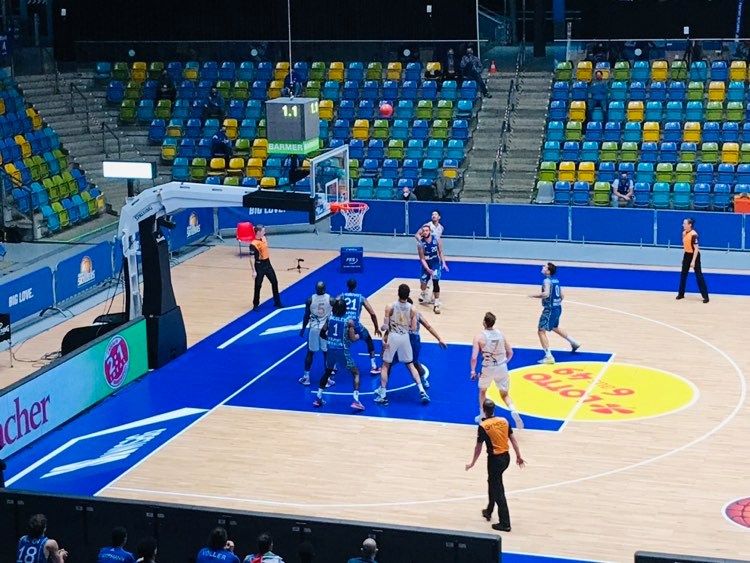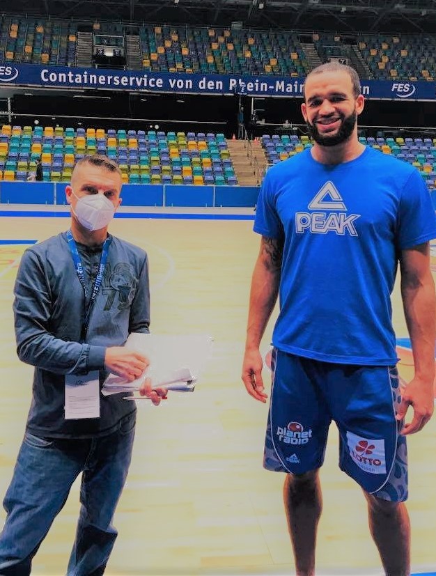 The Fraport Skyliners came out on fire on offense hitting their first 4 shots executing well in the paint. Ex Auburn(NCAA) great Quantez Robertson scored in the first 5 seconds with a lay in, ex wiha Panthers Schwenningen forward Rasheed Moore went coast to coast with the lay in, ex Davidson)NCAA) guard Jon Axel Gudmundsson nailed a 10 footer and ex Vechta center Michael Kessens scored on the pick and role. Braunschweig also got their offense going getting a lay in from ex Munich guard Karim Jallow and ex medi Bayreuth forward Lukas Meissner scored a trey as Frankfurt had the 8-5 lead. Frankfurt had some serious early foul problems which led to them losing the lead. Quantez Robertson was hit really hard with 2 fouls in 15 seconds which led to another Meissner trey and 12-8 Braunschweig advantage. Frankfurt then got 4 consecutive free throws from ex Miami(NCAA) center Kamari Murphy to dead lock the contest at 12-12. Braunschweig continued to win the lead back getting back to back lay ins from Jallow and Meissner who showcased his fine inside out game early. Gudmundsson tied the game at 16-16 with free throws and a lay in. Moore really stepped it up in the last minute picking his spots well and hitting two 3 pointers in a row. He hadn´t played since the Crailsheim game 96 hours earlier as he had suffered severe back pain and couldn´t practice the days leading up to this game, but the Skyliners medical staff had put him together perfect for the game. Moore finished with 16 points and continues to demonstrate that his rare amazing climb from the German fourth division to the BBL was no fluke. “It has been an adjustment in the BBL playing against top scale athletes. I think that the BBL games and practices have helped. I feel good. I am now where I wanted to be 4 years ago. It is nice to see that hard work pays off”, stressed Rasheed Moore. German top talent Luc Van Slooten ended the first quarter with a buzzer beater trey as the game was dead locked 22-22.
