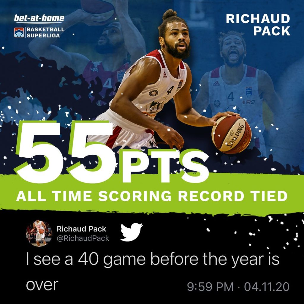 So let´s rewind a few days to December, 26th 2020, a day which forever will be remembered in Austrian basketball. Pack entered the game and just started scoring and didn´t stop. Of course having the OT period helped his totals, but overall everything worked for him. Sometimes what you eat can have an effect on you. Fraport Skyliner Matt Mobley scored 31 points in a win last weekend and had a Christmas pizza, but Richaud Pack didn´t need any food for extra strength, but moreover it was motivation for past failures on the court. “I didn’t eat anything special. However I was inspired. My recent frustrations inspired me. My President motivated me by having a personal talk with me and giving me confidence and comfort to do what I did. Ironically, the same person who had the all-time record, Stjepan Stazic, is the one who talked to me about the mind set it takes to do such a thing. So again, thanks to him”, warned Richaud Pack. Prior to this monumental scoring clinic, the American had had problems shooting against St.Poelten and Klosterneuburg combining for only 7 points on 3/19 shooting. He knew that something definitely had to change and just put in the extra extra work and also mentally was a different type of warrior. “I locked in differently. I did solo workouts when no one else was at the gym. I shot a couple hundred shots on game day in the morning. The main change was in my mentality. I was in attack mode no matter what play was called, no matter how many minutes I played, and no matter who thought I shouldn’t be shooting the ball. I felt like I had to remind the league, our team and my coach that I was that guy. I had a point to prove”, stressed Richaud Pack.