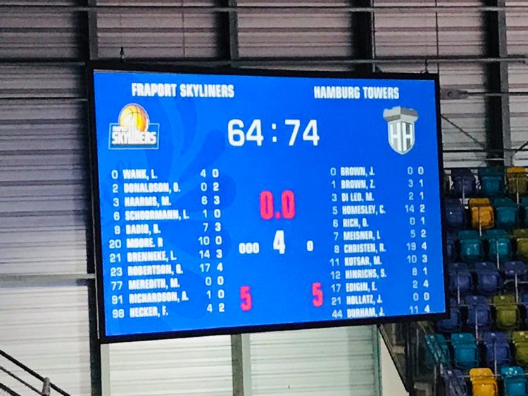 In the fourth quarter the Fraport Skyliners made one last push to cut the Hamburg lead down to 8 points, but time ran out. Lukas Wank got Frankfurt on the board first, but Hamburg continued to execute well getting baskets from Durham and Kotsar to keep the comfortable 72-53 lead. Frankfurt then had their best stretch going on a 11-0 run to cut Hamburg´s lead down to 72-64. In the run they got great production and support from their young kinds Felix Hecker who was only playing his third easyCredit BBL game had 4 points and Lorenz Brenneke supplied four points. In this good stretch, the Fraport Skyliners were without their two guards Donovan Donaldson and Len Schoormann. It had been a day to forget for both as they combined for 9 turnovers. They combined for 1 point and 6 assists in 45 minutes. The club has a point guard problem, but head coach Diego OCampo was as neutral as a coach can be. “The problem is more our turnovers and how they occur. It is my responsibility and a team problem. I don´t want to point fingers, but give my support. We know that we have a problem and need to find a solution”, warned Diego Ocampo. Durham closed out the game with a lay in for the win. “We were too focused on closing out the game. We got away form playing the kind of basketball we know how”, stated Hamburg Towers guard Max DiLeo concnering the Frankfurt 11-0 run. The Hamburg Towers were led by Robin Christen with 19 points. Caleb Homesley had 14 points and Jabril Durham added 11 points, 11 assists and 8 steals while the Fraport Skyliners were led by Quantez Robertson with 17 points and Lorenz Brenneke added 14 points and 9 boards. The Hamburg Towers shot 39% from the field and 37% from outside and had 36 rebounds and 16 turnovers while the Fraport Skyliners shot 42% from the field and 29% from outside and had 37 rebounds and 26 turnovers.
