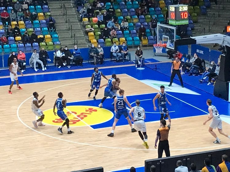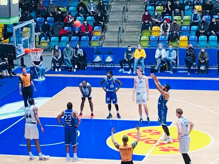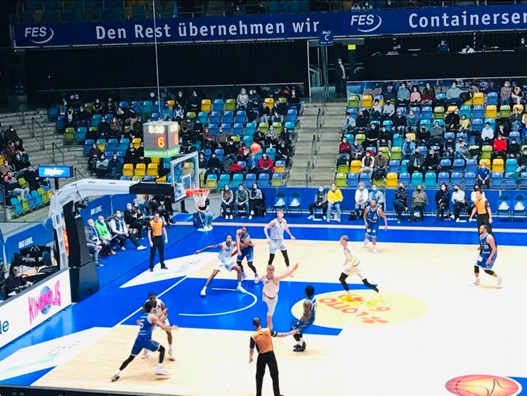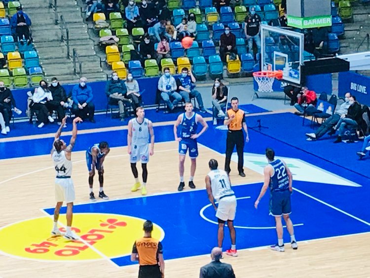 The Fraport Skyliners had fortune as they had key players Will Cherry and Brancou Badio back while the Niners Chemnitz had had Covid problems, but had most guys back except for German Nelson Weidemann. The first quarter was a back and forth tug of war as no team could escape the other as there were 10 lead changes. Fraport Skyliner Quantez Robertson started off hot with a trey, but would have a dismal shooting day, but on defense he quickly sparked the team with two steals which led to transition buckets from Cherry and Badio. The Niners Chemnitz were fueled by their Lithuanuan sniper Minduagas Susinskas who from a distance looks like Franz Wagner stepped up with 8 points. The club was also aided by baskets from ex Marquette American Trent Locket and ex EWE Baskets guard Franz Massenat. Frankfurt also received timely support from Jamel Mclean and Len Schoormann who supplied big baskets. Having ex NBA player Will Cherry back at the point was very noticeable. “He recognizes situations very well and goes there. When there are break downs, he fixes it. He makes good decisions”, stated Nift Al-Shamal (Iraq-Superleague) guard Jermale Jones. After 10 minutes the Fraport Skyliners had the slim 21-19 edge. Chemnitz shot over 50% and Frankfurt over 40%. It was a pretty even game. Frankfurt played solid defense and rebounded the ball well”, added ex TV Lich guard Jermale Jones.