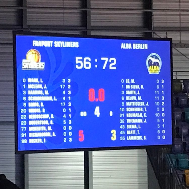 The Fraport Skyliners were unable to take their momentum of the third quarter into the fourth quarter and instead took an extreme 180 degrees turn scoring only a pathetic 2 points the whole quarter and allowing Alba Berlin to walk into the sunset with the win. The Fraport Skyliners actually began well getting DeBisschop involved throwing up a lob pass that he converted into an easy basket as Frankfurt trailed only 58-56. It was hard to believe that they would never score again after this. What happened after this must have been a bad dream and one that head coach Diego Ocampo surely might have some sleepless nights. For the next 5-6 minutes Alba Berlin would score only 5 points as Blatt nailed a trey and Koumadje made a tip in dunk for the 63-56 advantage. Frankfurt got chance after chance to execute on offense, but couldn´t. You could notice that that third quarter of high energy took a toll on them. Their offense was slower and their shots were untypically bad off the mark. They were unable to hit the ocean. Luke Sikma made a lay in at the 2,30 minute mark as Alba Berlin led 65-56. Mattisseck then made a trey which led to a Delow three and then it was game over as Alba Berlin led 68-56. Alba Berlin then took advantage of Frankfurt´s five team fouls and got free throws from Koumadje, Mattisseck and Jonas Thiemann. “Frankfurt´s shot were flat and short. Fatigue got to them. We stepped up our defense to get stops”, said Jaleen Smith. “Not being able to get points as a team hurt us mentally. When we couldn´t get stops, our confidence went down”, stressed Quantez Robertson. Alba Berlin was led by Jaleen Smith and Malte Delow with 11 points apiece while Christ Koumadje and Jonas Mattisseck added 10 points apiece. The Fraport Skyliners were led by Brancou Badio and Jamel Mclean with 17 points a piece. Alba Berlin shot 40% from the field and 37% from outside and had 46 rebounds and 22 turnovers while the Fraport Skyliners shot 34% from the field and 19% from outside and had 35 rebounds and 17 turnovers.