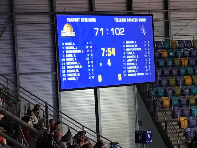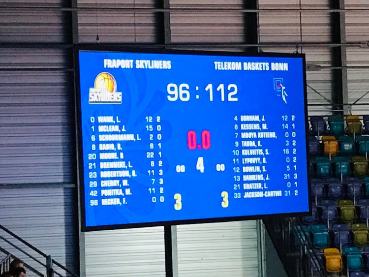 In the second quarter, the Fraport Skyliners were able to keep the game close, but mid way through came the turning point as the Telekom Baskets Bonn blasted off on a 11-0 run and would never look back. The guests continued to show their smooth offense scoring 37 points and was led by Parker Jackson-Cartwright who dazzled everyone over and over with his undeniable quickness and incredible finishing abilities. He hit a seemingly impossible three pointer from the corner and also added a easy lay in where he showed his lightening speed. ‘He is definitely quicker than Dashaun Wood. If we worried too much about the screen and turned our head, he was gone. He made shot after shot and never stopped’, commented Quantez Robertson. American Javontae Hawkins who learned his craft at Fordham (NCAA) also got going adding five points early. Frankfurt got valuable baskets from Mclean, a three from Brancou Badio and a lay in on transition by Marcel Ponitka as Frankfurt had the slim 38-35 advantage. But then came the turning point as the Telekom Baskets Bonn erupted on a 11-0 run to lead 49-38. In the run, the guests continued to get non stop production from future easyCredit BBL MVP Jackson-Cartwright as he steered hot shooting with a trey and 20 footer while Kulvietis made another three pointer and ex Skyliner Michael Kessens scored inside twice as Bonn really understood how to show their inside out game at it’s best. Frankfurt retaliated getting a groove on offense again, but couldn’t make any ground as Bonn also kept reacting to Frankfurt’s punches with their own blows. Frankfurt’s best player on this dismal afternoon was Rasheed Moore who found his touch nailing two three pointers and Badio and German national player Lukas Wank also scored inside. The Telekom Baskets Bonn continued to let it rain three’s as Hawkins and Bowlin connected while Jackson-Cartwright also made a lay in. At the break the Telekom Baskets Bonn had the comfortable 60-50 lead. ‘We got beat too easy and didn’t keep a good eye on their shooters. We did a good job keeping them from the free throw line, but we still gave up to many second chance points’, added Quantez Robertson.