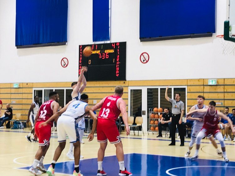 The Fraport Skyliners Juniors showed their total offensive arsenal in the first quarter jumping all over the Depant Giessen 46ers Rackelos leading 15-4 after only a few minutes. Frankfurt did a super job getting their bigs Jordan Samare and Alexander Richardson involved as they combined for 8 points while ex Nurnberg guard Matthew Meredith supplied 5 points and ex Ehingen forward Nils Leonhardt had a lay in. The way Frankfurt was playing in the first few minutes was as if they were on a leisurely Sunday stroll in the park. The ball movement was great, their transition game was working and on defense, they were anticipating well and getting into passing lanes forcing turnovers. Giessen couldn’t muster any real offense as they were playing with many young Germans and a few extra NBBL (U-19) players except for ex German national player Johannes Lischka who got two buckets using his massive strength to his advantage. Frankfurt kept on the pressure on offense and continued to get good execution from their bench. Three and D player Risto Vasiljevic hit a trey and little used athletic wing player Isaac Obanor scored twice inside including a beautiful lay in from the corner by getting by two players and then making a fancy reverse lay up. ‘We always see him making shots like that in practice. He especially likes to do it with his left hand’, stated Matthew Meredith. Giessen executed better on offense, but couldn’t keep pace with Frankfurt because of Frankfurt’s great start. Giessen got two baskets from young German Tristan Goebel, but still trailed 31-19 after 10 minutes. Frankfurt was shooting hot at 72% from the field and 60% from outside while Giessen was doing everything inside being at 52% from the field. Frankfurt also had the rebound and turnover advantage. ‘Everything worked for us. We hit shots and were in rhythm. We really wanted to win’, said Matthew Meredith.
