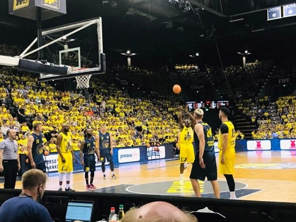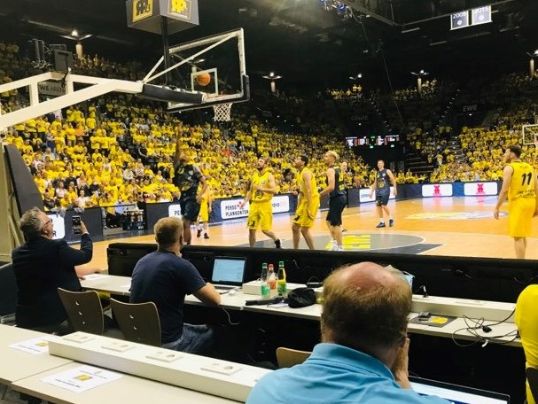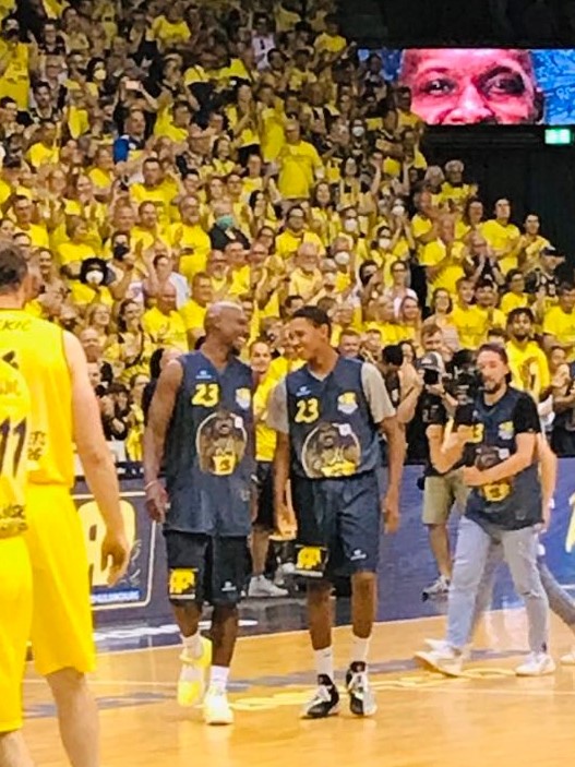 Let me back track 16 hours earlier. When you drive 4-5 hours to see Rickey Paulding why not combine it with another highlight off the court? Literally 2 hours before I entered the EWE Baskets big arena in Oldenburg, I was playing in the North Sea with my son Evan at Wilhelmshafen only 40 minutes away. The weather was great. So I went from the beach to the arena for the Rickey Paulding event. I don’t know how many times Rickey Paulding had to explain in the last 13 years after the magnificent 2009 BBL title why he never left Oldenburg, but it must have been very much. The normal bla bla of feeling comfortable there with my family is something he probably uttered just as much as the young folk of today taking a Lebron over Michael as the GOAT, but then again I could very well have understood that being so close to the water could also been a reason for the family to remain there. Leaving the very warm water wasn’t easy, but I finally wanted to taste the breathtaking atmosphere of the living room of Rickey Paulding. I arrived at 5.00 pm an hour before the festivities were to start and right away bumped into people I have met over the last 20 years. I remember visiting the small and big Oldenburg arena and actually was there for 12 games in that span calling games. I remember seeing Rickey Paulding for the first time in his first season in Oldenburg in the 2007-2008 season. It was actually only his second game in a EWE Baskets jersey against the Deutsche Bank Skyliners of Frankfurt. He contributed 12 points in a 76-65 win. I remember interviewing him after the game. Already there his million-dollar smile stood out and he had a full head of hair. I had other nice memories there seeing many great games including the playoff series against Frankfurt in 2009 as well having a very entertaining post game interview with Jacob Burtschi in 2013. Before I entered the big arena, I bumped into ex Player Dirk Madrich and Nigel Pruitt a guy I had recently covered in Frankfurt as well as some die hard fans that I had got to know over the years. Other people there that I recognized were head coach Mauro Parra, player Robert Drijencic son of ex Oldenburg coach Mladen, ex Oldenburg coach Sebastian Machowski, ex coach Ralph Held and legendary German referee Boris Schmidt. I also purchased a Rickey Paulding book that had been published about his 15 years in Oldenburg. Then I entered the big arena and was just overwhelmed. All fans in yellow wearing their yellow Rickey Paulding tee-shirts that had been produced for the evening.