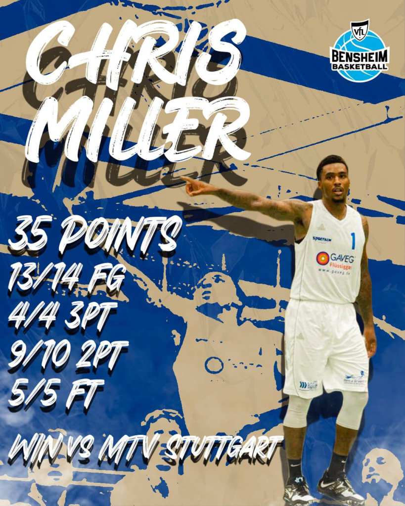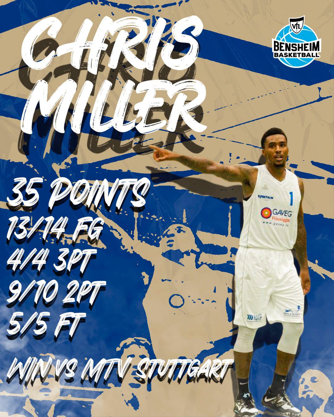 Christopher Miller (192-G-1993, college: Salem) is a 29 year old 193cm guard from Brooklyn, New York who is playing his eighth professional season and first with VFL Bensheim. He played 3 seasons with the Giessen Pointers (Germany-Regionalliga) and last season averaged 17.4ppg, 5.6rpg, 3.2apg, 2.0spg, FGP: 50.5%, 3PT: 17.5%, FT: 78.6%. He has had experience in countries like El Salvador and Bosnia. He recently played for the South Shore Monarchs (TBL) playing 8 games averaging 22.4ppg, 5.6rpg, 4.3apg, 1.6spg, FGP: 50.8%, 3PT: 35.0%, FT: 83.3%. He began his basketball career at Clinton Community College and also played two years at Salem University (NCAA2). This season he teams up with Miles Schmidt-Scheuber with weekly chats about his basketball season.