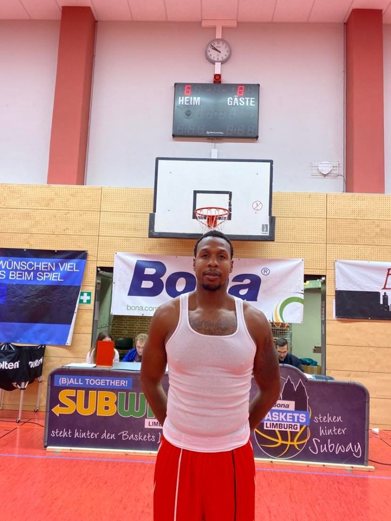 Fans saw a different Justin Stallbohm as he was wearing a mask. He had broken his nose 4 days earlier, but was still able to play. He will be operated in Wiesbaden on Tuesday and probably miss a few weeks. MTV Stuttgart got off to a quick start taking the rapid 14-4 lead. American Edward Hall who works on an American airbase as an IT specialist had fond memories from last season where he poured in 30 points with 8 three’s against Limburg and in the opening minutes was on a scoring romp again netting 9 points as he was being a menace on the offensive board. But at the same time the guests also got valuable support from other players like athletic German Jannis Holzwarth and ex ANGT player Fekremariam Abraha (186-PG-1999). MTV Stuttgart came out dictating the pace with superb ball movement that had Limburg always reeling to get into good defensive position. At the same time, they were controlling the boards and having an aggressive defense that was forcing Limburg to too many early turnovers and hampering their set play. Not having top player and work horse KJ Sherril who is more than mentally prepared to lace them up against Lich soon was difficult to compensate as a huge hole in the scoring department was there. Croatian point guard Matej Kljaic tried his best to carry the team and did. Limburg went on a 9-3 run and suddenly were only trailing 16-13. His quickness as always led to an easy lay in and a difficult step back trey was also in his arsenal. Limburg captain Justin Stallbohm made some key steals to help break Stuttgart’s rhythm. But Limburg wasn’t able to hold that brief moment of control allowing the guests to close out the first quarter with a 7-0 run to lead 23-13 as Greek guard Vassilis Lampropoulos hit a trey and 39 year old veteran Christian Grundlach who is in his 14th season with Stuttgart made a lay in. Combined these two equal 70 years of ag. ‘We always try to come out strong and focused and build off that. I felt that we did a good job doing that’, stated Edward Hall.