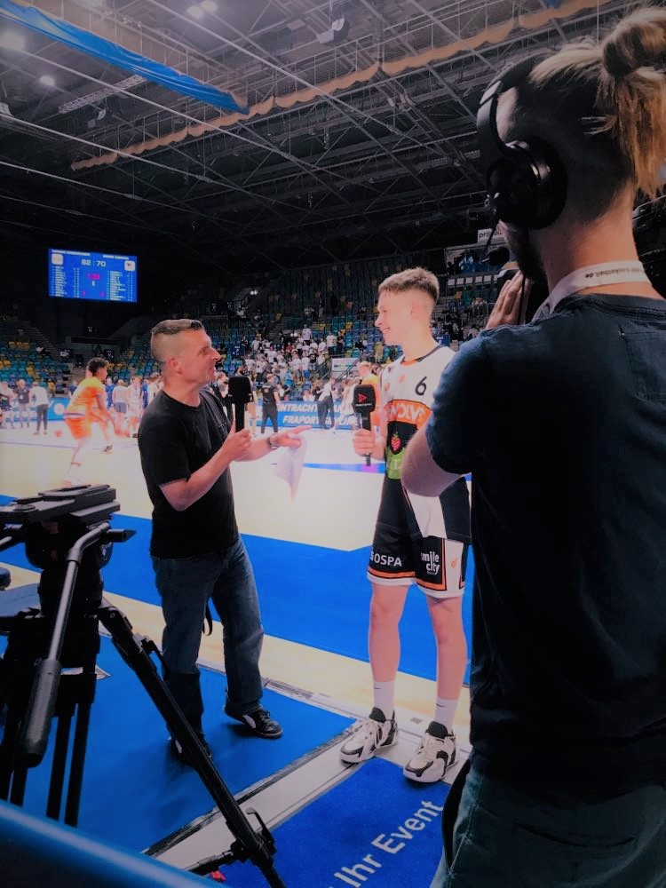Miles Schmidt-Scheuber interviewing Rostock phenom Roy Krupnikas at the 2022 JBBL(U-16) German championship in Frankfurt