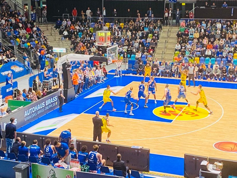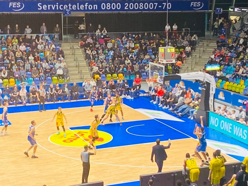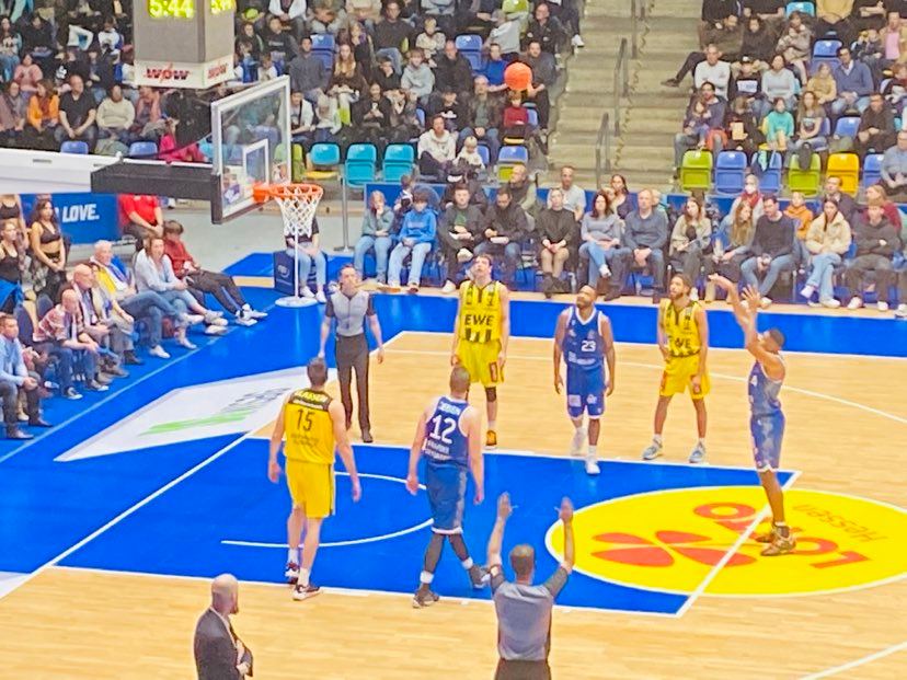 The Fraport Skyliners didn’t have a good start into the game as they quickly lost their forward Einaras Tubutis after 28 seconds and couldn’t muster much offense as the guests jumped out to the 11-5 lead getting to the free line and getting baskets from ex Western Washington (NCAA) guard Trey Drechsel, ex Hagen center Owen Klassen who was massive on defense with 5 blocks and free throws from new German national player Max DiLeo. Frankfurt got support from captain Lukas Wank who contributed 5 points, but then picked up 3 quick fouls. The guests continued to put a lot of pressure on Frankfurt and kept the lead as ex Crailsheim guard Dewayne Russell (180-PG-1994, college: GCU) hit a 20 footer and made free throws. But the Fraport Skyliners got some energy in the last minute getting a lay in from ex Wurzburg guard Joshua Obiesie and a lay in from Martinas Geben who had been denied the ball well by the EWE Baskets. Frankfurt’s offense had gotten better with a few three’s as the guests hadn’t hit a trey and were only at 29% from the field. Both teams had 10 rebounds, but Frankfurt had an unacceptable 7 turnovers. ‘I feel like we were too physical and got out of position. That led to our bad start. It also didn’t help us that we lost Tubutis at the start’, stated Quantez Robertson.