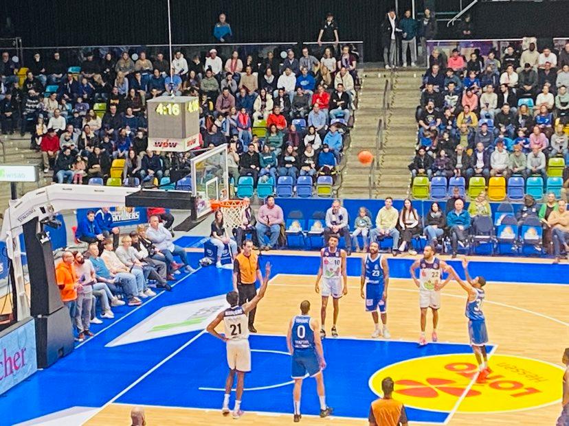 The second quarter was a very very tight affair as no team could get away from the other. The Rostock SeaWolves kept the lead, but Frankfurt was always close and even had the brief lead in the last minutes. Rostock did a good job getting 5 stops to begin, but couldn’t really profit from it except getting a Tyler Nelson three pointer to lead 28-25. The Fraport Skyliners finally got on the board at the 6,50 minute mark as Beliauskas made a step back jumper to trail Rostock 28-27. Alston then made his first field goal of the contest at the 5,54 minute mark with a trey as Rostock led 31-27. Frankfurt got baskets from Beliauskas on transition and a 20 footer by American J J Frazier, but the SeaWolves kept the lead getting a lay in by ex ACB player Elias Valtonen and a dunk by Mawugbe. Rostock could of led by 10 points, but Mawugbe had extreme difficulty at the free throw line as after 40 minutes his stat line read 3/12, but Rostock still led 36-31. But Frankfurt kept pouring on the pressure and fighting and struck back with a 8-2 run to retake the lead 39-38. Frankfurt did a great job in the run playing their fast game getting transition buckets from Robertson, Obiesie and Beliauskas. Nelson got Rostock the lead back with a basket, but at half-time, the game was tied at 42-42. The Rostock SeaWolves were unable to take advantage of their height as Frankfurt was playing with only 1 real center Matt Haarms who wasn’t at 100% and when Tez Robertson played center, they could take advantage of the mismatches. ‘We did a good job getting out on transition and pushing the ball quickly after getting rebounds. Everybody was running from position 1-5’, stated Quantez Robertson.
