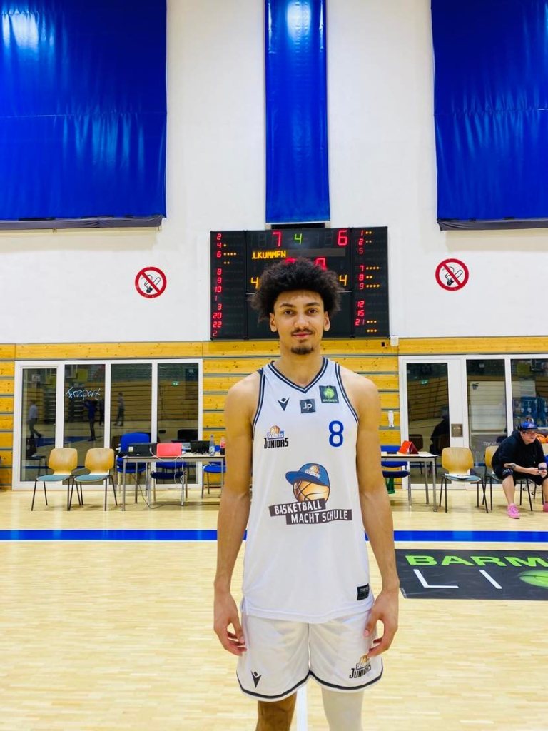 Growing up one thing I can remember my dad saying to me every now and then were words like remember this name or don’t forget the name or remember my words. I guess it was his way of trying to be hip and to feel important and smart. To tell you the truth, it was so long ago that I can’t remember exactly what examples he was boasting then, but in the summer of 2022, I had a dej vu moment again where I was able to think about my pops again. The Fraport Skyliners announced the signing of massive German talent Justin Onyejiaka (195-F-2004) and I had that feeling that makes you go hmmmmmm. Thanks Arsenio Hall for giving the world that remark. I remember hearing the name leading up to the 2022 NBBL top 4 where he couldn’t play with Rasta Vechta because of injury. He was their most vital player and it was a real shame for their program that he wasn’t able to show his abilities on a big stage. The funny thing is back in May 2022, I remember hearing that name but didn’t make the connection to retired baller Torvoris Baker who had a stellar 10 plus professional career in Germany and proved then that he belonged to the best big men in the Pro A when he was with Osnabrueck and Gotha. Back in November 2021, I interviewed Baker and at the end of the interview, he left the chat with these words of wisdom. ‘One last thing before the interview is over. Keep both eyes and ears open for Justin Onyejiaka. He’s going to be the next best player coming out of Germany. Don’t forget the name. Stay tuned’, warned Torvoris Baker. Obviously Justin Onyejiaka proved last season that he belonged to the best players in the NBBL, but this season I have been able see him play on a regular basis developing his game further with the Fraport Skyliners Juniors in the Pro B and have witnessed his hard work pay off with minutes with easyCredit BBL team Fraport Skyliners.
