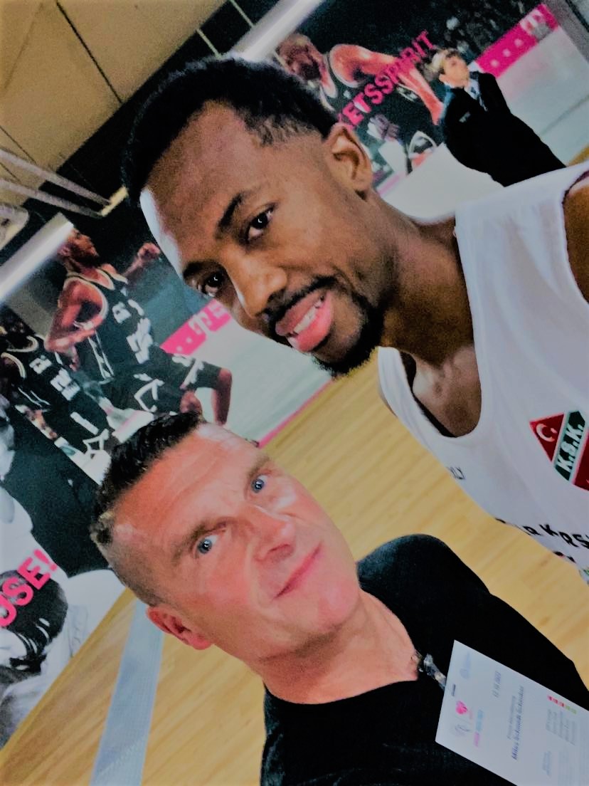 Miles Schmidt-Scheuber meeting Errick McCollum in Bonn Germany in 2022 before a BCL game