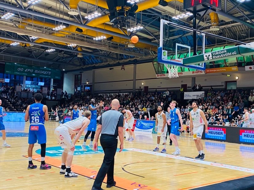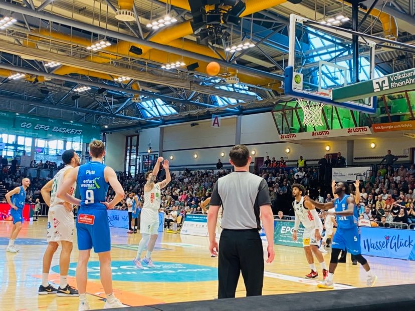 The EPG Baskets continued to control the game not allowing the CATL Basketball Lowen to get over the hump as they couldn’t cut the Koblenz lead under 5 points. Despite Guy Edi being on the bench for great lengths because of 3 fouls, the Erfurt role players picked up the slack. Ex BBL player Marvin Heckel did a great job showing offensive power scoring 5 points, but Erfurt remained close thanks to the great player of Pleta who took on responsibility in Edi’s absence with 9 points and Erfurt trailed only 37-30. Pleta scored 4 free throws and connected on a trey and lay in. But the EPG Baskets Koblenz simply had too much firepower and weapons always ready for an answer. German Jan Heber gave Erfurt 2 key lay in’s, but Koblenz got massive support from the bench from ex Itzehoe forward Niclas Sperber who contributed 7 points including a pretty reverse lay up for the 48-38 Koblenz advantage. ‘I never saw Sperber like this. He was so focused and mentally prepared’, stated Tobias Hosper. Erfurt never gave up and continued to chip away getting added spark from their young Germans as Pleta made a big dunk. He was being put in great position by guards Lyles and Heber and little used 18 year old Lenni Kunzewitsch made a clutch trey to cut Koblenz’s lead to 48-43. But Koblenz didn’t let down after that closing out the second quarter strong with Friederici free throws and a Moore lay in to lead 50-43. ‘Both teams continued to play at a high intensity, but Koblenz rhythm had gone down a bit. Erfurt kept fighting and had patience getting good shots’, stated Tobias Hosper. Koblenz shot 48% from the field and 25% from outside, but the CATL Basketball Lowen shot an incredible 92% 11/12 from the 2 point range while both teams had 15 rebounds, but Erfurt had 11 turnovers and Koblenz 6 turnovers.