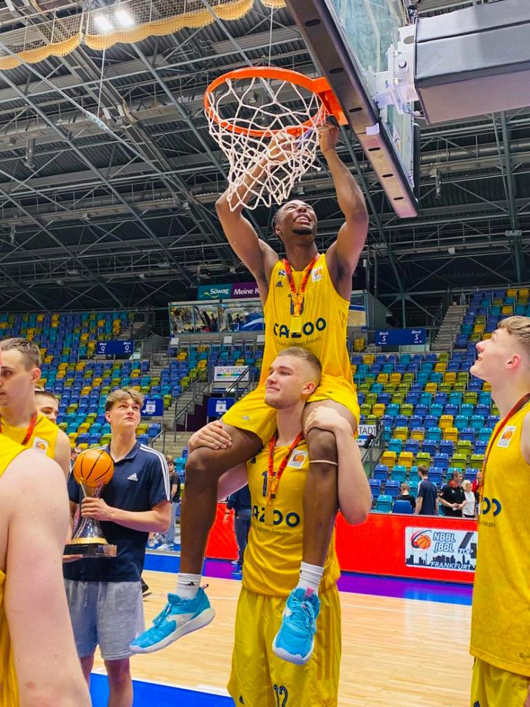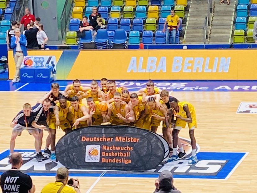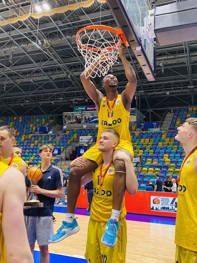 It was Sunday morning in Frankfurt and the Alba Berlin NBBL and JBBL teams were getting ready to embark on playing the 2023 youth finals and it was the calm before the storm. It was a beautiful sunny morning and who would of thought that hours later they would have won the double, but nobody could have predicted that these 2 games would probably go down in German youth history as the 2 greatest finals back to back ever on the same day. The Alba Berlin JBBL (U-16) began with a thrilling win over the underdog Eintracht Frankfurt-Fraport Skyliners that took them to double OT as 2 standout Germans Matthieu Grujicic and Ivan Crnjac combined for an incredible 93 points as Gruijcic scored a mindboggling 52 points and had some carefully thinking the next Doncic. But the Alba Berlin NBBL team took it to another level having a fierce battle against the Young Rasta Dragons who were looking for revenge after losing last years final to them. Last year the Vechta squad was pooped and lost badly after upsetting FC Bayren Munich, but this time took the mighty Berlin team to the wire and lost on a heart breaking buzzer beater with an in your face buzzer beater by Nils Machowski (191-PG-2004) 78-75. How much pain can a club take 2 years in a row? Last season Kaya Bayram celebrated the Alba Berlin win with his team and this season played against his ex team with Vechta and had his hand in Machowski’s face and had to endure his friend making the game winning shot. ‘We had a great season. We wanted to top the Vechta season with a win after the other teams had reached the Pro A and Pro B final. You can lose a game, but losing like this on a buzzer beater is so tough. I know Nils since he is 9 years old. What does he do, he hits the game winner in my face. I’m so proud of my team. The team took me in and gave me trust. It is like a family here. This loss hurts so much’, stressed Kaya Bayram. After getting a shower at the post game interview for sporttotal.tv, the hero Machowski was able to reflect about the historic final. ‘This whole game was back and forth. No team could break free. I though after Rikus Schulte hit the three in the fourth quarter, the game was decided, but no. They always fought back. It was finally a nice final’, smiled Alba Berlin guard Nils Machowski. ‘This was the best final ever. It was such a tight game and a real fight until the end’, added Alba Berlin forward Ellias Rapieque.