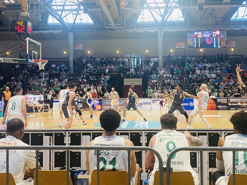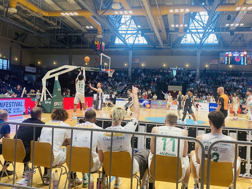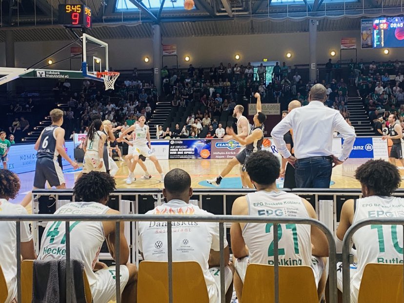 The EPG Baskets Koblenz jumped all over Rasta Vechta 2 taking the 8-0 lead as ex BBL player Dominque Johnson drilled home 2 three’s and captain Marvin Heckel made a lay in. The guests finally got on the board with baskets from Germans and ex Cologne guard Leon Okpara and top German prospect Johan Gruenloh with a tip in dunk. But the EPG Baskets Koblenz just kept putting on pressure at both ends and extended their lead to 20-6 going on a 12-2 run. In the run top Pro B center Moses Poelking took advantage of his physicality and just dominated the zone with 3 baskets and overall the team was sharing the ball around nicely as ex Temple (NCAA) guard Alani Moore hit a jumper after breaking an ankle, Heckel made a runner and Johnson a lay in. ‘It was a super start by us. We were very focused. We played the way we should and like we were a league higher’, said EPG Baskets Koblenz CEO Thomas Klein. After back to back buckets by Roman Bedime and Okpara, Koblenz closed out the first quarter with a 5-0 run to lead 25-11 after 10 minutes. Alani Moore made free throws and ex Bremerhaven forward Niclas Sperber nailed a three pointer. ‘With the exception of two minutes, it was a good quarter. We were brutally focused and very efficient. You could see that there was an unbelievable difference in physicality in our favor’, commented Thomas Klein.