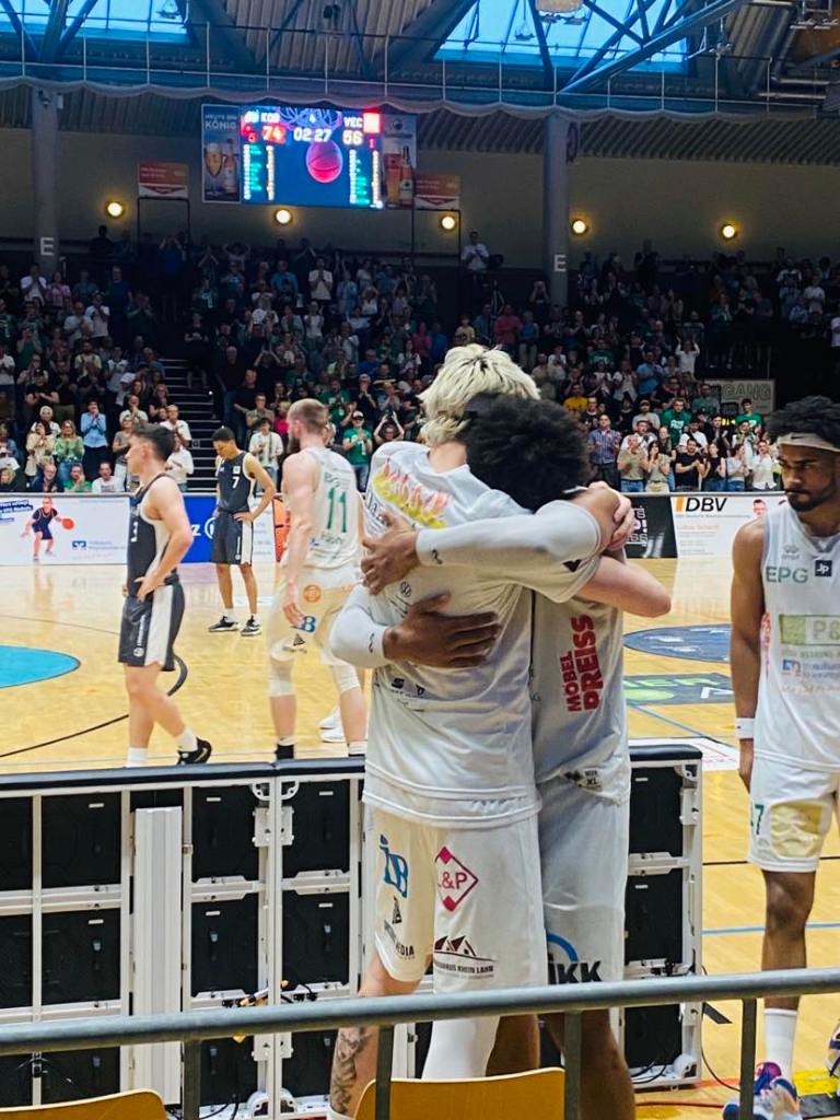 Brian Butler and Niclas Sperber hug after Butler leaves the court after his last game for the EPG Baskets Koblenz