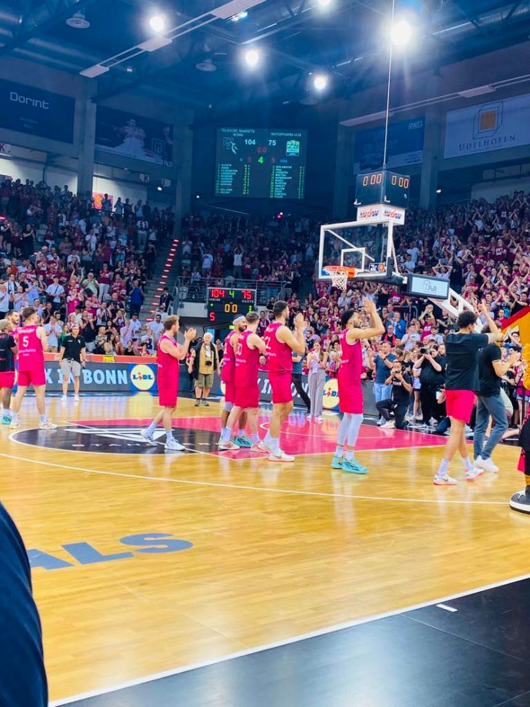 There is always a first time. Who would of thought that the Telekom Baskets Bonn couldn’t master crunch-time in their own building in the 2022-2023 season? They had mowed down most of their opponents during the regular season, had extreme ease against the Niners Chemnitz and even against an aggressive and fighting squad from Ludwigsburg still it didn’t seem like they would ever lose again at home this season. But beware ratiopharm ulm is for real. Many may be blinded by TJ Shorts eccentric hairdo and the dominance of the Telekom Baskets Bonn, but there is a reason why Ulm got by Germany’s 2 most well-known teams Alba Berlin and FC Bayern Munich. In game 1, ratiopharm Ulm came to play and played an incredible game against Bonn showing that Bonn aren’t invincible in their own living room. Everyone knew that he game 1 loss would have the Telekom Baskets Bonn thinking and everyone knew that Bonn wouldn’t have another poor shooting night back to back again. Had they shot a little better in game 1 they probably would have won the game, because they ruled the boards. On a beautiful Sunday evening the two clubs came to battle again only 48 hours later and this time Bonn found the ocean again nailing 16 three’s, sharing the ball around beautifully and just playing Telekom Baskets Bonn basketball as they demolished ratiopharm Ulm 104-74. ‘We played with a lot more intensity. We simply did us. We focused on our identity for 40 minutes. We did what we do best with rebounding, limiting second chance points and limiting their transition’, said Telekom Baskets Bonn forward Tyson Ward. Ratiopharm Ulm fell apart midway through the second quarter and that was that. They allowed the Telekom Baskets Bonn to play their game and played catch up the rest of the way. ‘We didn’t have the needed intensity. We didn’t defend well, didn’t move the ball well and didn’t rebound well’, stressed ratiopharm Ulm guard Thomas Klepeisz.