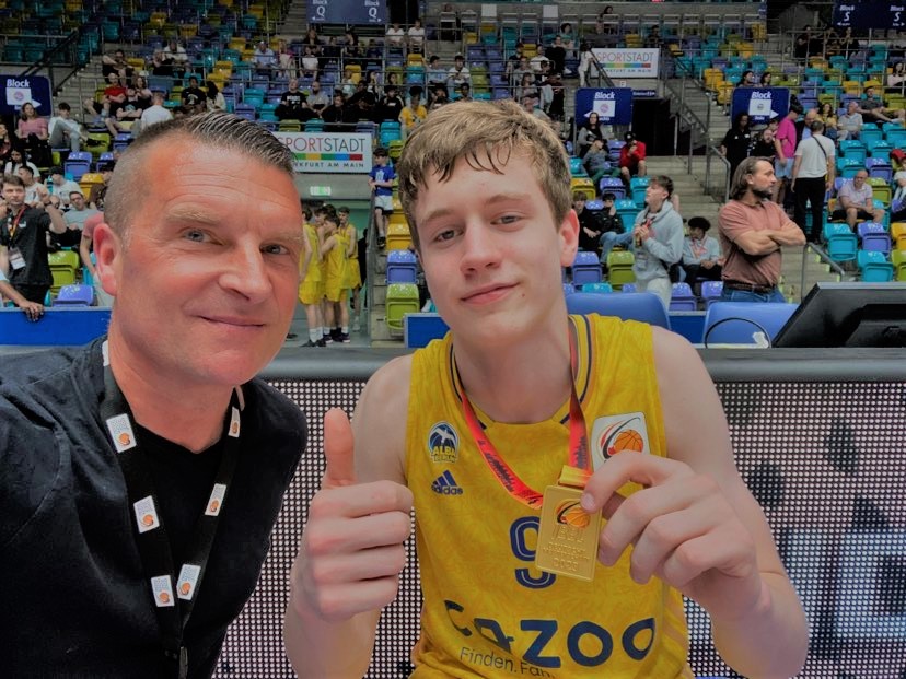 Miles Schmidt-Scheuber and Mathieu Grujicic after scoring 52 points in the 2023 JBBL final to pace Alba Berlin past Eintracht Frankfurt