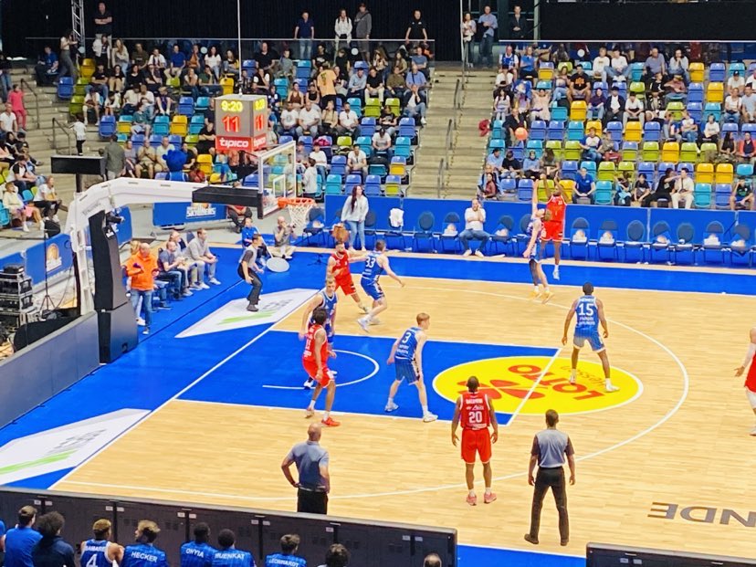 Both teams got their offenses rolling in the first quarter as MBC got baskets from Norwegian forward Chris-Edou Ndow as he supplied two while ex Ludwigsburg center Martin Breunig also connected on an off balance shot while Frankfurt was led by a one man wrecking crew with ex Carleton standout Aiden Warnholtz who was left a lot of room and didn´t hesitate scoring 9 of Frankfurt´s first 11 points in the first few minutes to lead 11-7. Frankfurt was demonstrating pretty team basketball and made good decisions while sprouting a lot of self-confidence. Frankfurt was playing good defense, but MBC was hitting tough contested shots that kept them in the game early. Frankfurt got a lot of production from everyone as young German big man Jordan Samare scored twice as he was put in good scoring position by the dimes from David Muenkat and Booker Coplin as Frankfurt led 26-19. But MBC always had an answer as Stephon Jelks scored getting a loose ball and German Kostja Mushidi made a lay in on transition. Aiden Warnholtz may have supplied the first ohhs and ahhs with Buckets but he showed on the last score that his passing my be his most beautiful asset as he supplied Samare with the perfect shovel pass and lay in for the 28-23 lead after 10 minutes. “Coach has told us since day one to always be aggressive at both ends. But we didn´t come out like that, but came out on our heels. We had to many turnovers and weren´t aggressive enough”, stated ex Louisiana (NCAA) guard Johnathan Stove.