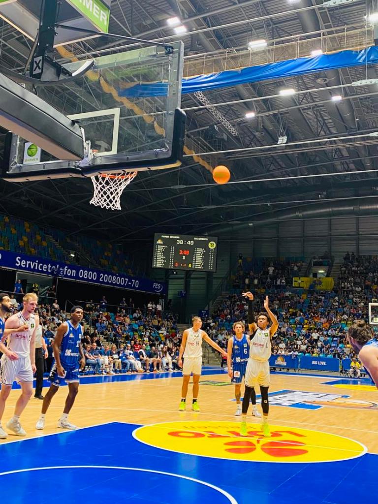 The Fraport Skyliners came into the game without guards Bruno Vrcic and Bruno Albrecht while BBC Bayreuth were without Mohamed Sillah and Philip Jalalpoor. There were a few lead changes at the start as Frankfurt was led by Booker Cooplin and the guests got buckets from American Aaron Carver and Shane Gatling that played 2 seasons at Colorado (NCAA). Frankfurt had difficulty with the good man defense of Bayreuth. BBC Bayreuth then found some real daylight on offense cruising out on a lethal 12-0 run to lead 17-6. In the run, they were led by Norwegian forward Kristian Sjolund with 8 points who dropped consecutive three pointers and hit a runner and Fofana made a big dunk. A few miscommunications cost Frankfurt 2 three´s and just a loss of defensive intensity suddenly turned the game in the direction of BBC Bayreuth. But the Fraport Skyliners didn´t hang their heads in the sand like a bashful dog but closed out the first quarter strong with a 7-1 run to get back into the game trailing 18-13. In the run, Frankfurt showed that basketball can be so easy as they simply upped their aggressiveness and attacked the rim and were rewarded with 2 buckets from Canadian David Muenkat and a jumper by ex Carleton guard Aiden Warnhorst. “We had a sloppy start. We have to bring more energy. It took us a while to get awake”, stated Booker Coplin. The Fraport Skyliners couldn´t hit the ocean from downtown while the guests were at 43%, but Frankfurt made their mark on the boards 12-7 and had the 5-1 offensive rebound edge.