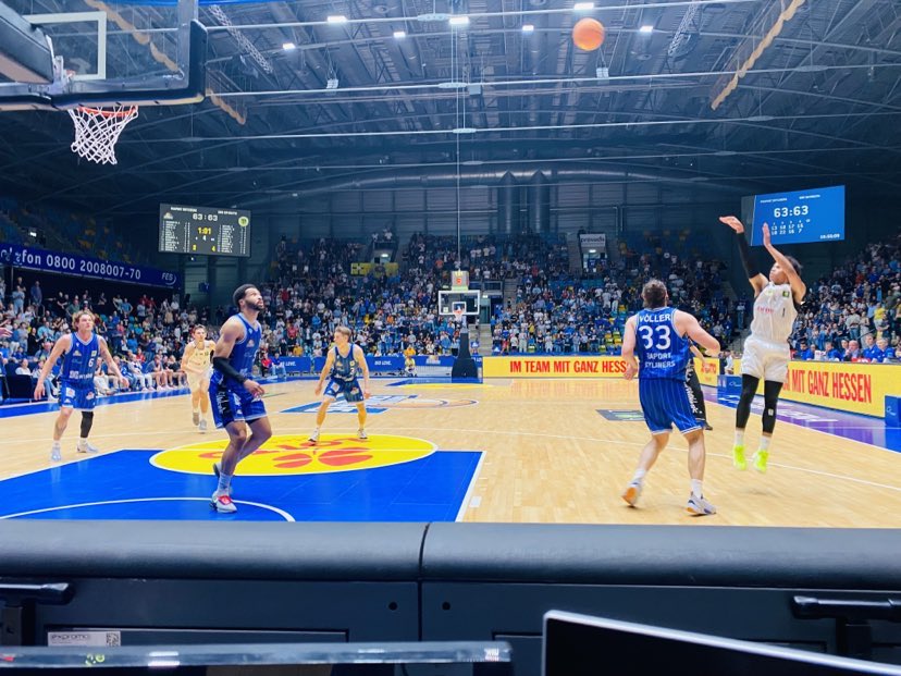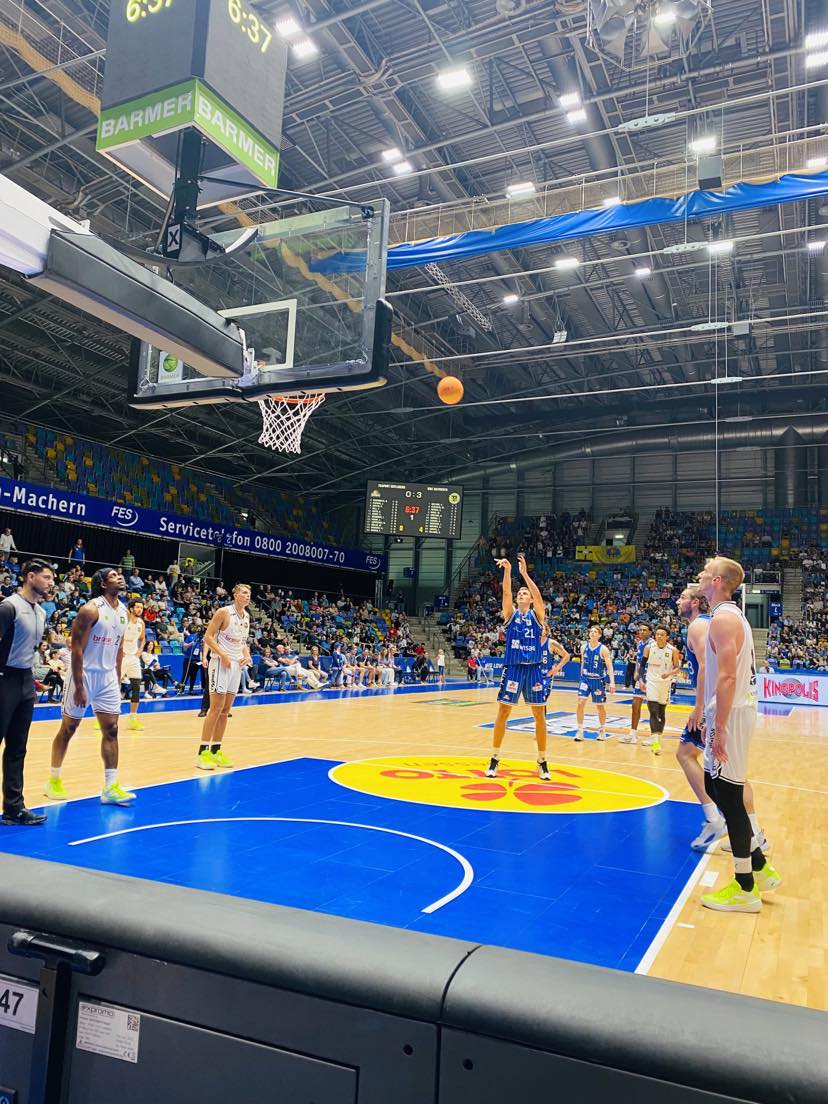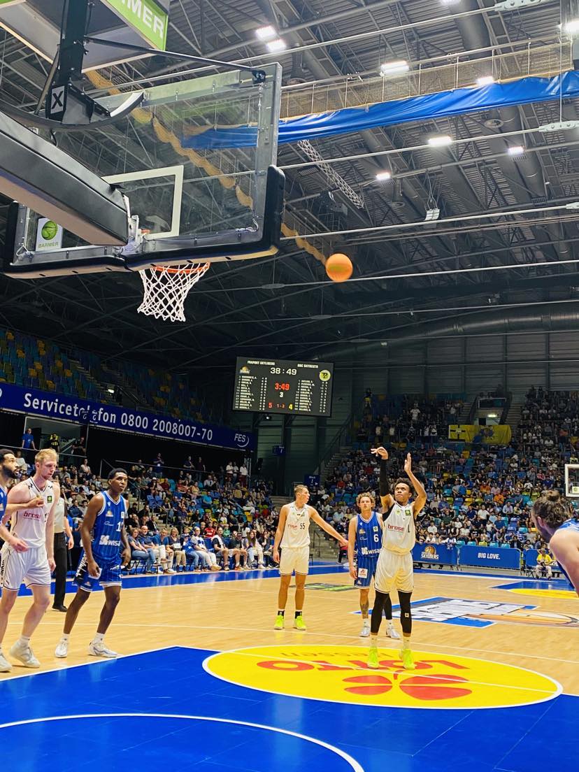The Fraport Skyliners came into the game without guards Bruno Vrcic and Bruno Albrecht while BBC Bayreuth were without Mohamed Sillah and Philip Jalalpoor. There were a few lead changes at the start as Frankfurt was led by Booker Cooplin and the guests got buckets from American Aaron Carver and Shane Gatling that played 2 seasons at Colorado (NCAA). Frankfurt had difficulty with the good man defense of Bayreuth. BBC Bayreuth then found some real daylight on offense cruising out on a lethal 12-0 run to lead 17-6. In the run, they were led by Norwegian forward Kristian Sjolund with 8 points who dropped consecutive three pointers and hit a runner and Fofana made a big dunk. A few miscommunications cost Frankfurt 2 three´s and just a loss of defensive intensity suddenly turned the game in the direction of BBC Bayreuth. But the Fraport Skyliners didn´t hang their heads in the sand like a bashful dog but closed out the first quarter strong with a 7-1 run to get back into the game trailing 18-13. In the run, Frankfurt showed that basketball can be so easy as they simply upped their aggressiveness and attacked the rim and were rewarded with 2 buckets from Canadian David Muenkat and a jumper by ex Carleton guard Aiden Warnhorst. “We had a sloppy start. We have to bring more energy. It took us a while to get awake”, stated Booker Coplin. The Fraport Skyliners couldn´t hit the ocean from downtown while the guests were at 43%, but Frankfurt made their mark on the boards 12-7 and had the 5-1 offensive rebound edge.