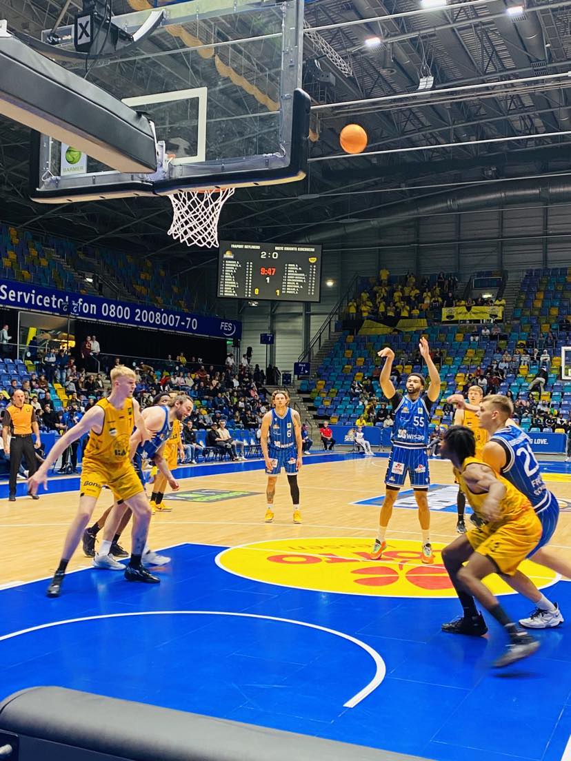 Both teams found their rhythm well in the first minutes. The Fraport Skyliners did a fine job getting 2018 NBBL champion Lorenz Brenneke into good position to score twice while Kirchheim received a deep three pointer from the Main river from Michael Flowers and ex Orange Academy center Antonio Dorn was banging on the boards getting offensive rebounds. Especially Dorn´s presence and intensity carried Kirchheim on the boards as Kirchheim would grab 7 offensive rebounds. After trailing early, Frankfurt got the lead back with a trey from rookie Aiden Warnholtz to lead 11-10 who would finish with a dismal 3 points after getting in early foul trouble and never finding his rhythm. Frankfurt would keep the lead simply because they executed well and were spreading the ball around well. A Jordan Samare lay in and Cameron Henry three pointer gave Frankfurt the 15-11 advantage. Ex Belmont center Nick Muszynski made 2 late baskets with his beautiful old school play while Kayne Henry made a massive dunk, but a David Muenkat three secured the tight 20-18 lead for the Fraport Skyliners after 10 minutes. “We had problems slowing down the offense. Muszynski was really good. He kept them in the game. Once we eliminated their second chance points and contained Flowers better, we were able to control game better”, stated ex Indiana State guard Cameron Henry. The Fraport Skyliners shot 50% from the field and 29% from outside and had 9 rebounds and 3 turnovers while the Bozic Estriche Knights Kirchheim shot 37% from the field and 20% from outside and had 13 13 rebounds and 3 turnovers.