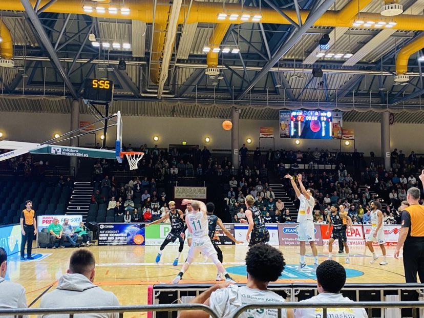 In the second quarter the UNI Baskets Munster continued their fine team basketball and led by as much as 12 points, but the EPG Baskets Koblenz continued to fight and had good phases in comebacks getting as close as 3 points, but at the break were down by 7 points. The Uni Baskets Munster began the second quarter with a rapid 9-2 run to get their biggest lead of the game at 34-22. Munster shared the ball nicely and got scoring production from many as ex Wurzburg center Jonas Weitzel made a lay in, ex Hagen guard Jasper Guenther connected from the corner, Touray made a hook shot and Gruehn another three pointer. Munster did a good job finding their spots which Koblenz couldn´t close well enough and rebounded the ball well. But basketball will always be a game of runs and now it was the EPG Baskets Koblenz turn as they went on a 12-3 run to trail only 37-34. In the run, Koblenz received good production Gabriel De Olveira who scored twice while they also got vital transition buckets from Heckel and Pluskota. But Koblenz couldn´t turn off the defensive lapses as they continued to give up easy baskets in the zone as Wetzel and Scott scored for the Munster 42-34 advantage. Munster closed out the second quarter well continuing to execute their offense well as Scott found his spots again scoring on a lay in while Wess nailed a trey. American Trey Hall scored at the buzzer as Koblenz trailed only 47-40 at half-time. “We lost the second quarter only by 2 points. We executed our offense better, but we allowed way too many easy points and didn´t make the easy shots”, stated Thomas Klein.