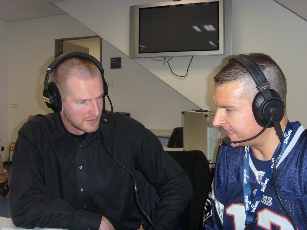 Miles Schmidt-Scheuber interviewing 1993 NCAA champion with North Carolina and German basketball legend Henrik Rodl at the 2009 BBL all star game in Mannheim, Germany