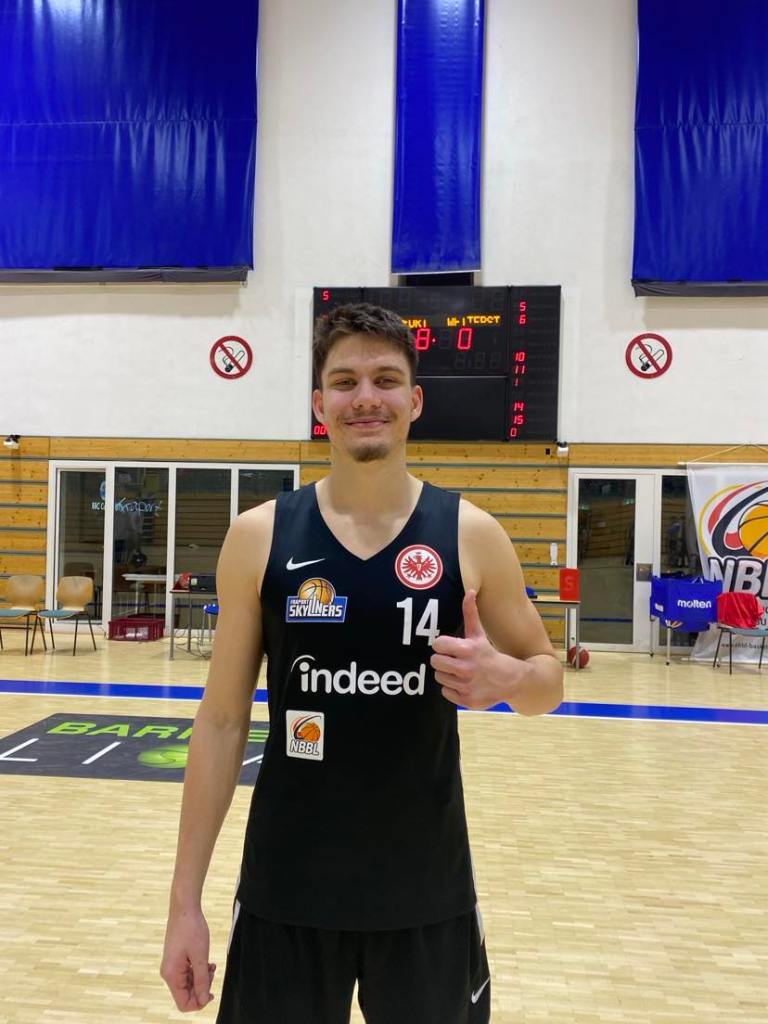 The scoring onslaught continued in the second quarter as Eintracht Frankfurt-Fraport Skyliners added 28 points and they tightened up their defense allowing only 8 points to lead by a crazy 30 points at half-time. Frankfurt got going cruising on a 9-2 run to extend their lead to 40-22. In the run Frankfurt got key support from Ivan Crnjac with 5 points as he attacked the rim twice and scored and Joscha Zentgraf scored again as did defensive specialist Finley Pruever. The Frankfurt defense layed out the press defense that gave Wurzburg many problems as they coughed up the ball 5 times in the first few minutes thanks to the aggressive Frankfurt guard defenders. The defense remained consistent as Namori Omog stayed aggressive and registered 3 steals in a row that led to a transition basket by him and three pointer by Ivan Crnjac for the 45-24 advantage. “Namori played incredible. He was in a hole for a few games, but he showed just how important he can be for us. It is great that he is playing so well again”, stated Dusan Nikolic. Frankfurt´s aggressive defense forced 12 turnovers in the second quarter. It was apparent that Eintracht Frankfurt-Fraport Skyliners wanted to decide the game by half-time and kept the pressure on at both ends and closed out the second quarter with a 14-5 run to lead 59-29 at the break. In the run Eintracht Frankfurt-Fraport Skyliners got 4 points from Nikolic, 5 points from Marvin Esser who came back the day after and had an incredible 9/8 game in the Pro B win over Coburg and Jamie Edoka also added a left handed lay in. Nikolic doesn´t only shine with his scoring, but also has potent passing skills. On the one Esser bucket, he displayed a pretty bounce pass similar to Luka Doncic who likes to undress that from his sleeve during games. “I have copied that pass from Luka. I like to practice it. I think that I´m getting more of a feel from his game”, added Dusan Nikolic. Eintracht Frankfurt-Fraport Skyliners shot 56% from the field and 29% from the three point line and had 17 rebounds and 6 turnovers while Wurzburg shot 38% from the field and 0% from the three point line and had 15 rebounds and 16 turnovers. “Our defense totally took them out. We got great pressure from Omog and Pruever. We got in passing lanes and got easy transition baskets”, expressed Dusan Nikolic.