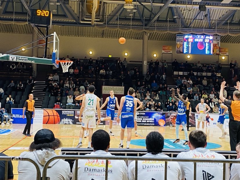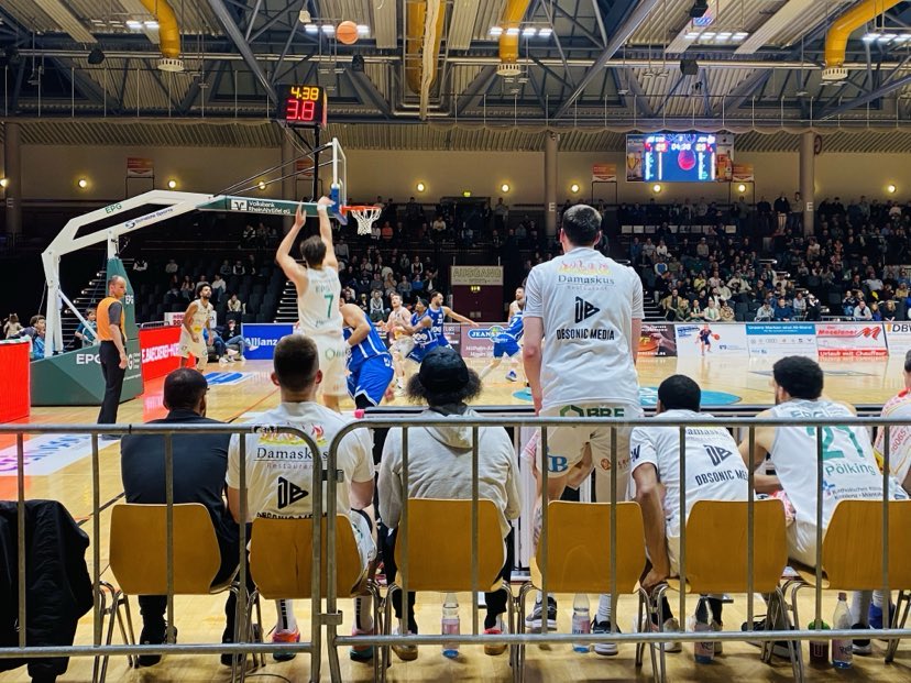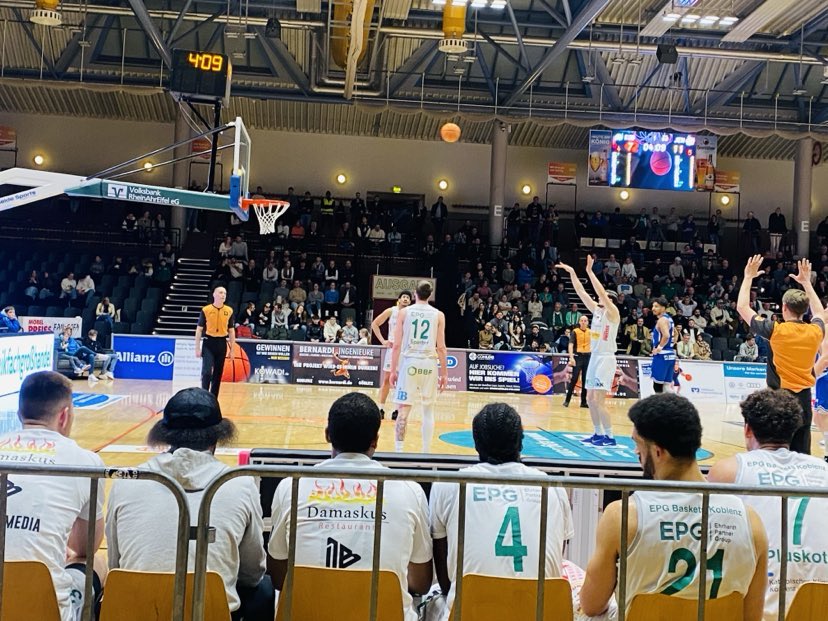 The first quarter was a back and fourth battle as no team was able to get away from the other. EPG Baskets Koblenz center Maurice Pluskota got going quickly with 2 baskets, but Medipolis SC Jena led 9-4 quickly getting crucial buckets from ex Shaw University (NCAA2) great Amir Hinton with a lay in while ex Giessen 46er guard Joshiko Saibou (187-PG-1990) hit a three pointer at the shot clock buzzer. Medipolis SC Jena did a good job not letting Koblenz inside and forcing them to tough shots. Medipolis SC Jena continued to move the ball well and got great support from their bench from young Germans Raphael Falkenthal and Rafael Rodriguez with baskets, but the EPG Baskets Koblenz finally got their long ball to drop as ex Rhondorf center Gabriel De Olveira and Heckel scored as Jena led only 13-11. After a key Leo Saffer basket that was polished with a pretty Nicolas Sperber bullet pass, Medipolis SC Jena continued to keep the lead as Saibou made a tough step back jumper and ex Fraport Skyliner Rasheed Moore connected on free throws for the 18-13 advantage. Koblenz ended the first quarter with a beautiful Heckel no look pass in traffic as he almost lost the ball, but regrouped and found Saffer for the lay in as the guests led 18-15 after 10 minutes. “That was a super pass from him. He almost turned it over, but made a great play. It was an open game. Our offense was working and we matched their physicality well. Jena forced us to have to take three´s”, stated EPG Baskets Koblenz sport director Thomas Klein.