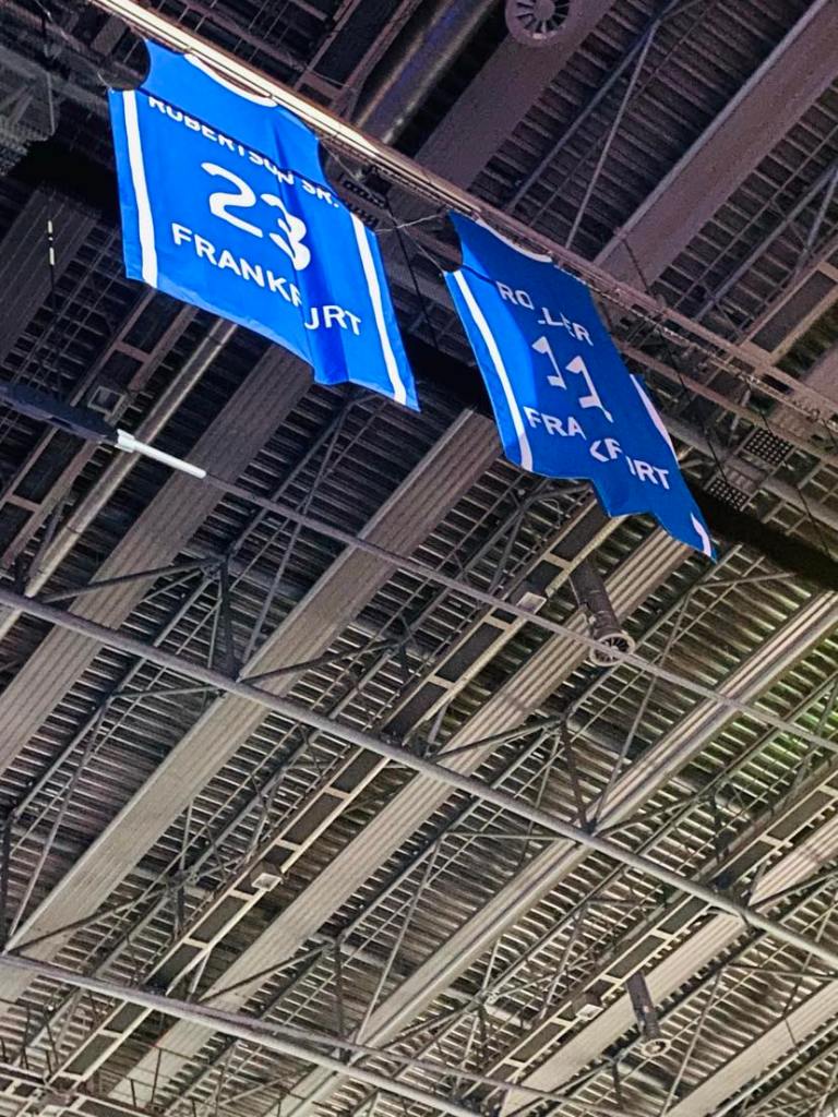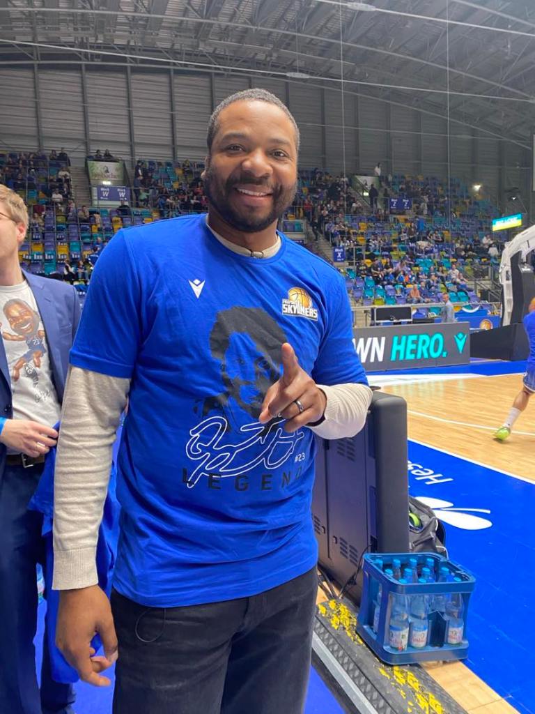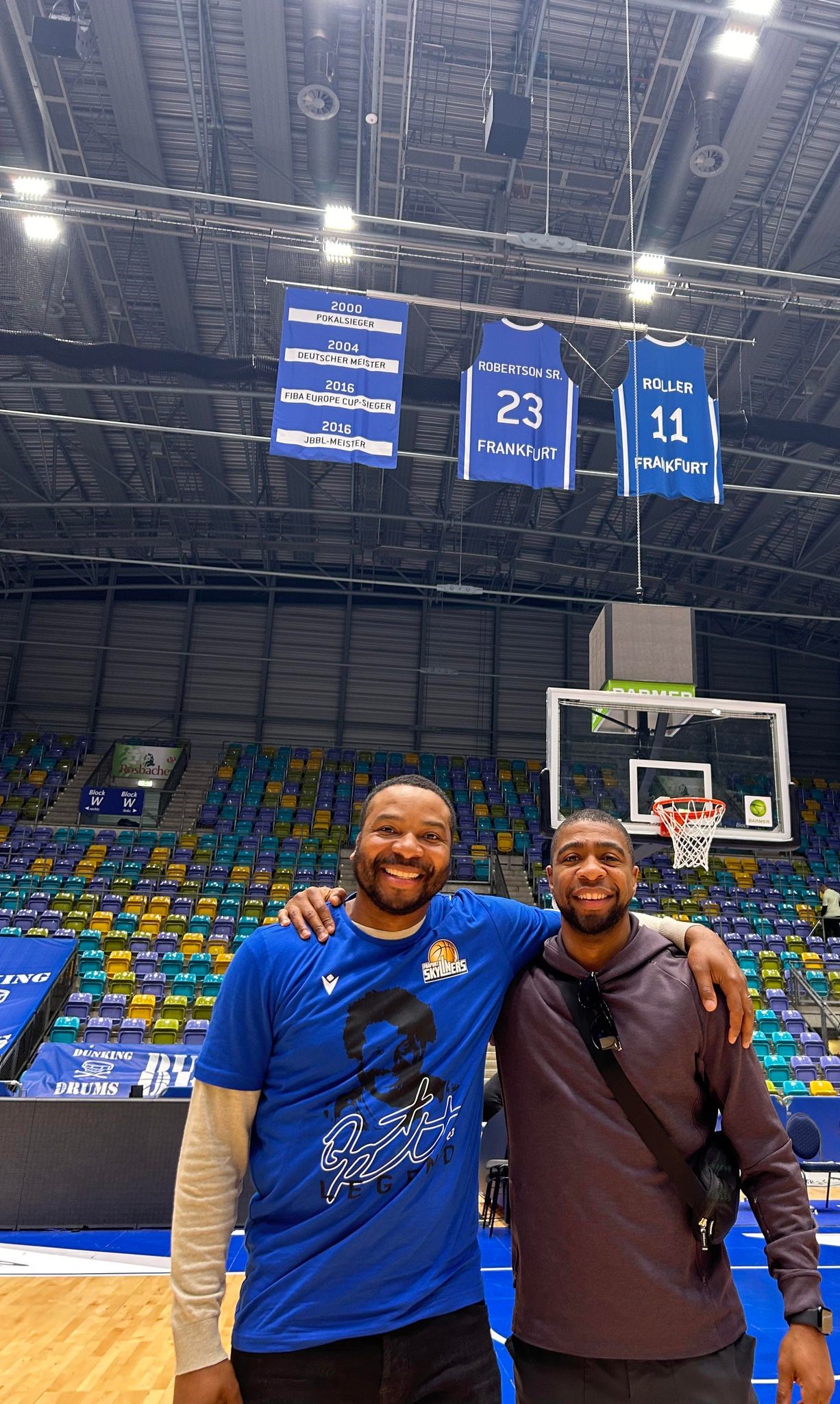 In the days Leading up to the Quantez Robertson #23 Jersey retirement ceremony, I was wondering which ex teammates would show up in the arena to pay their respects. A lot of Robertson´s teammates are still active overseas, so it was tough to have them there. Many of his ex teammates that are Americans are retired and didn´t have the time to make the trip overseas simply because the date was only announced a few weeks ago. I was hoping to see some guys and did. I was pleased to see ex Euroleague player Danilo Barthel who won a chip with Tez in 2016. I also looked twice when I saw Rasheed Moore who played 2 seasons with Tez and now is playing in Jena. He had had a game the night before and had an off day on Sunday. Moore developed into a very good player in Frankfurt and it was obvious that Tez had had a big effect on him. “He was the ultimate leader. To be able to learn from him meant the world for me., I´m so happy I could be here. It is something that I will never forget”, stated Rasheed Moore. Then as I turned my head, a familiar face popped up and one I totally had forgotten about with Jermale Jones (185-G-1986, college: Tuskegee). He is 37 year old guard and is still an active player currently playing in Switzerland and living in the beautiful city of Luzern. He is also a guy that I have developed a good relationship over the years and also seen him play on occasion. He played 5 years in Lich, about a 50 minute drive from Frankfurt and he often would watch Tez play in Frankfurt. He knows Tez since their college days and it was only obvious that he would be there to attend. When I asked him how often he believes he had watched Tez play in Frankfurt, he mentioned more than 20. I was at most games of Tez in the last 14 years in Frankfurt and would of thought that he was there more than 30-40 times. “Coming back to see Tez was an exciting feeling not seeing number 23 on the court just felt different to me being in the arena. I last seen him over the summer in June”, said Jermale Jones.