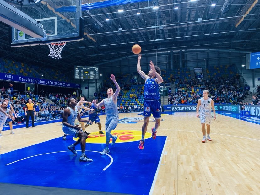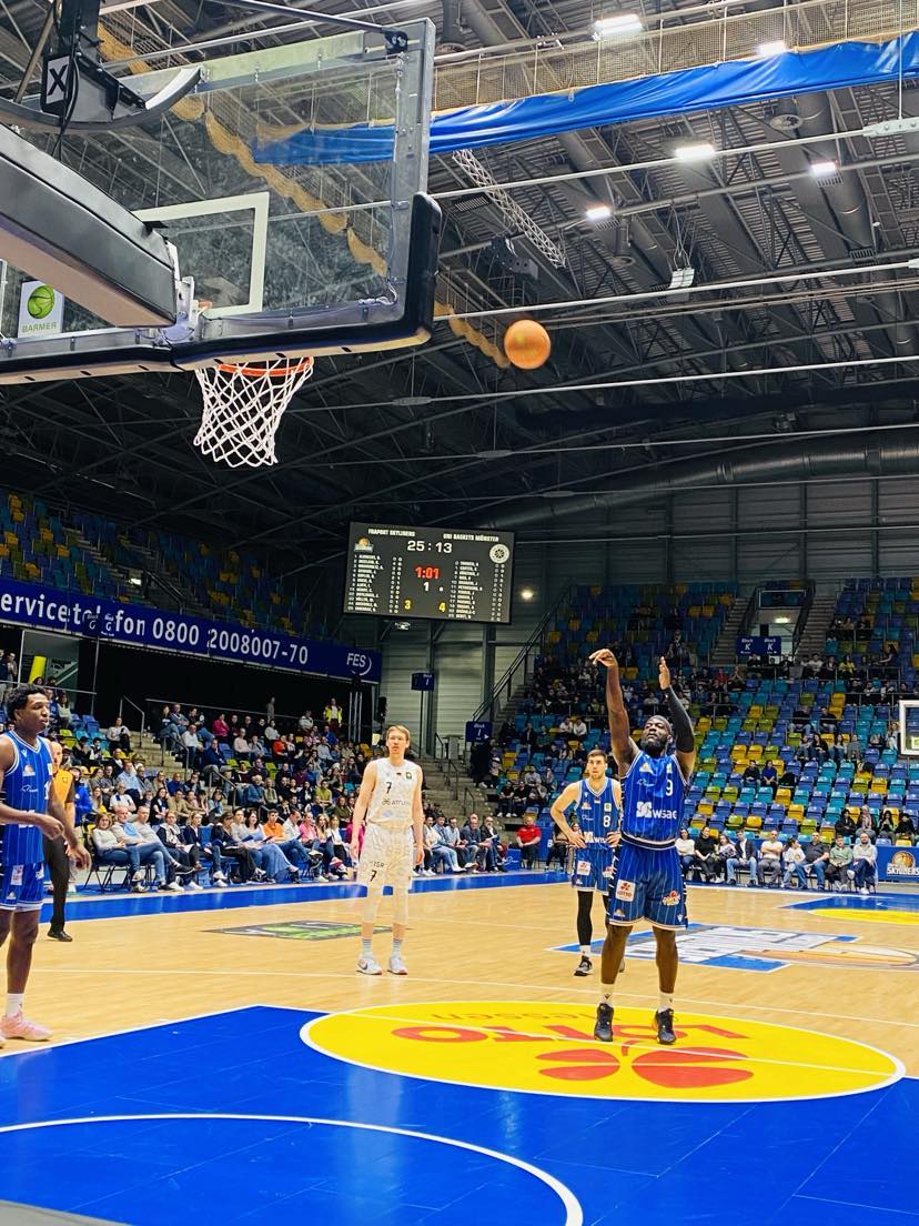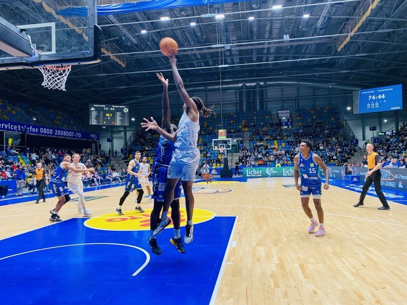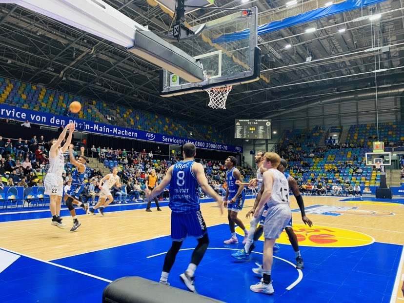 It didn´t surprise anyone that on Easter Sunday and the weather surprisingly warm for late March that only 2,400 people came to watch the game. The Fraport Skyliners had their woes as big men Lorenz Brenneke and Jacob Knauf were out, but after 40 minutes one could of carefully proclaimed that they didn´t need them on this afternoon. But those who did come saw a great start by the Fraport Skyliners as they jumped all over Munster rapidly to lead 9-2. Frankfurt let it rain three´s early as Canadians David Munekat and Aiden Warnholtz scored while ex Vechta forward Justin Onyejiaka used his great athleticism and attacking to score in the paint. Frankfurt began aggressively on defense not letting Munster inside the paint. Munster then was rewarded by 5 points from ex Skyliner Cosmo Gruehn who played youth basketball with Isaac Bonga back in the day. However Munster couldn´t make any ground as Muenkat got in the zone quickly connecting two more times from the parking lot lifting Frankfurt to the 19-9 lead. Frankfurt was focused and had a high intensity and defensively didn´t let the guests get into a flow and slowed down Scott and Touray nicely. Frankfurt continued to be super aggressive offensively as their bench stepped up as ex EWE Baskets guard Kevin Mcclain scored twice inside as Frankfurt led 25-11. However Frankfurt wasn´t able to close out the first quarter with the momentum as they allowed Munster on a 6-1 run to trail only 26-17. In the run, it was less Munster team play, but more superb isolation from the Americans as ex Shippensburg (NCAA2) guard Carlos Carter made 2 off balance shots and ex Auburn Montgomery (NCAA) American James Graham also scored. “We knew we had to make up for missing 2 of our bigs. We are a deep team and came out strong on the right note. We felt it early on offense and locked up on defense. Our play gave us a lot of self confidence”, warned Ife Ajayi. The Fraport Skyliners shot 63% from the field and 50% from outside and had 11 rebounds and 4 turnovers while the Uni Baskets Munster shot 38% from the field and 17% from outside and had 7 rebounds and 4 turnovers.