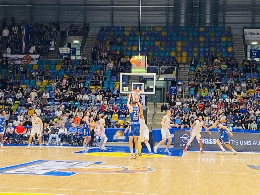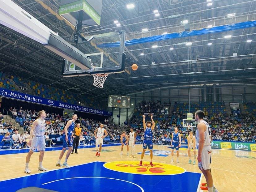 On a rather mild early spring day only 2,750 fans found their way into the arena. Medipolis Science City Jena were without their freak of nature Amir Hinton and in the first minutes didn´t seem to have needed him as they rode out on a rapid 7-2 lead. The guests moved the ball well playing good inside out ball as Moore began with a left handed lay in which was followed by a beautiful spin and finger tip roll in by German Stephan Haukohl and ex G-League player Blake Francis (183-PG-1998, college: Richmond) nailed a trey. Frankfurt´s offense sputtered as they had problems moving the ball and getting efficient shots. Frankfurt kept chipping away and really had to work for their shots and then found some daylight tying the game at 8-8 with a turn around shot from ex Indiana State (NCAA) guard Cameron Henry and a lay in from ex Schwenningen forward Jacob Knauf. Frankfurt was able to battle back as they heightened their defensive intensity which reward them on offense. Knauf added another three pointer as Frankfurt rolled with a 7-0 run and 11-8 advantage. Both teams reached the free throw line and after 10 minutes the game was dead locked at 12-12. “It was a very low scoring game where both teams showed their good defensive play. The game was also more physical than usual”, stated Rasheed Moore. The Fraport Skyliners shot 36% from the field and 33% from outside and had 7 rebounds and 5 turnovers while Medipolis Science City Jena shot 25% from the field and 20% from outside and had 8 rebounds and 5 turnovers.
