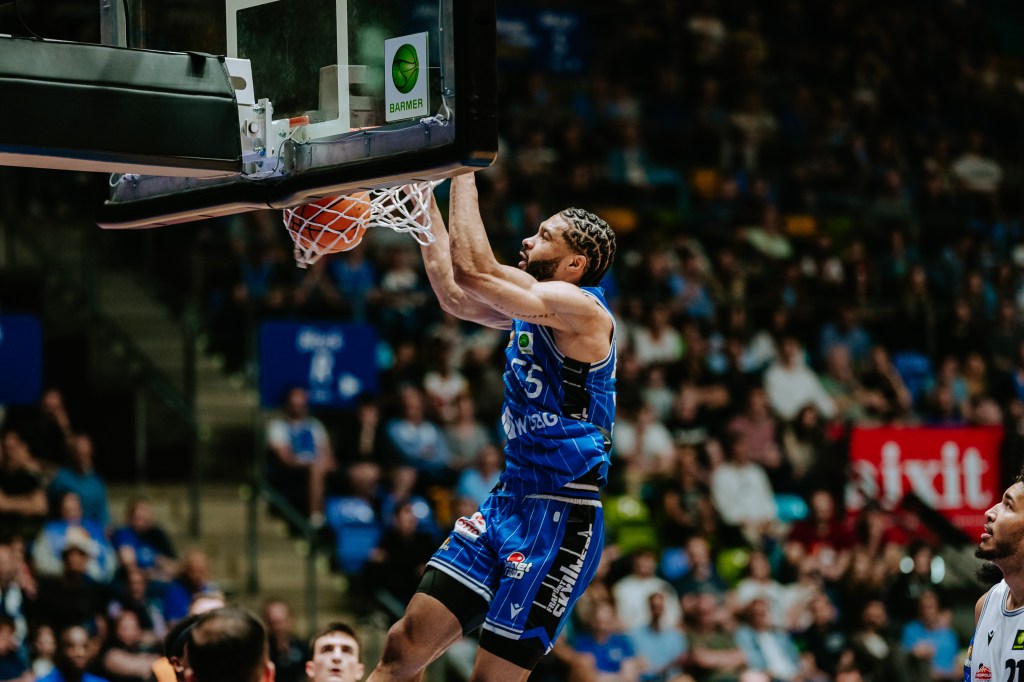The second quarter continued to be a real old fashioned battle with 2 teams playing hard defense and not giving away any simple gifts. There would be 6 lead changes and at the break the game was dead locked at 30-30. The Fraport Skyliners had the better start going on a 12-4 run to start to lead 22-16. Frankfurt did a good job getting to the free throw line and got an offensive rebound an put back by Ife Ajayi and lay in by ex Carleton great Aiden Warnholtz. At the end of the run, fans saw another incredible David Muenkat highlight play as he threw down an alley op dunk getting the perfect feed from Aiden Warnholtz. “That was a nice dunk. It came off a loose ball and then within 5 seconds came the dunk. It was an exciting moment”, stressed Trevian Bell. That dunk helped Frankfurt have the momentum a little while longer as Florida native Kevin McClain made free throws and German Jordan Samare connected for a three pointer to lead 28-21 with a few minutes to play. However Frankfurt couldn´t keep the momentum as they allowed a 9-2 run for the 30-30 score after 20 minutes. Sometimes in basketball all you need is a big play to get a team back on track and that is exactly what ex Richmond (NCAA) guard Blake Francis did making a trey and concerting on the 4 point play. German big man Robin Lodders added a tip and lay in to complete the run. “Francis always has moments like that. He is a phenomenal scorer. For him all it takes is to see one go in and then 2 or 3 will follow”, added Rasheed Moore. The Fraport Skyliners shot 32% from the field and 20% from the three point line and had 20 rebounds and 7 turnovers while Medipolis Science City Jena shot 33% from the field and 20% from the three point line and had 16 rebounds and 6 turnovers.