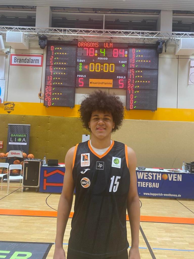 Jervis Scheffs who lists Hugo Gonzalez of Real Madrid as his toughest opponent he has ever faced in his career so far was born on October 7, 2007 in Bonn Germany. His dad is from West Africa and played basketball and his mom is half Polish and was a professional tennis player. He began to play tennis, but at age 8 noticed that it wasn´t as fun anymore and switched to basketball. His dad knew a lot about basketball and was his trainer. After playing for BG Bonn, he played JBBL (U-16) for the Telekom Baskets Bonn and then moved to the Ratiopharm Ulm program in 2022. Last season he was part of the Pro B team and played 2 NBBL games. He also show his game at the U-16 averaging 7.7ppg, 1.7rpg, 1.3apg, 1.0spg, FGP: 37.9%, 3PT: 38.5%, FT: 81.0% where he hit Finland for 17 points and played Adidas Next generation tournament averaging 4,8ppg, 1,3rpg and 1,3apg and scored 16 points against Greek team Panathinaikos. This season he made another jump in the Pro B averaging 13 minutes per game and averaging 5,4ppg. Being able to battle guys like Maxi Langenfeld and Philipp Hecker have helped his development. “I always want to play at the highest level. Being able to play against them daily really helps me. They are leaders on the team and that is where I want to be sometime. When you play against guys like that you improve”, stated Jervis Scheffs. He has shown at age 16 that he can paly with the best at the Pro B level and scored in double figures 3 times including 17 points against Leitershofen and 21 points in a massive win against top team Rhondorf on the road where he took over scoring 21 points. In the Regionalliga, he was a top player averaging 13,3ppg, 2,6rpg, and 1,8apg and scored in double figures in 7 games including 25 points against Haiterbach and 24 points against Mannheim. “The Regionalliga is a place young players can get valuable experience. It is a great league to take those first steps in a league where grown men play. The league is physical and faster than the youth leagues and a good place to get prepared for the next level Pro B”, warned Jervis Scheffs.