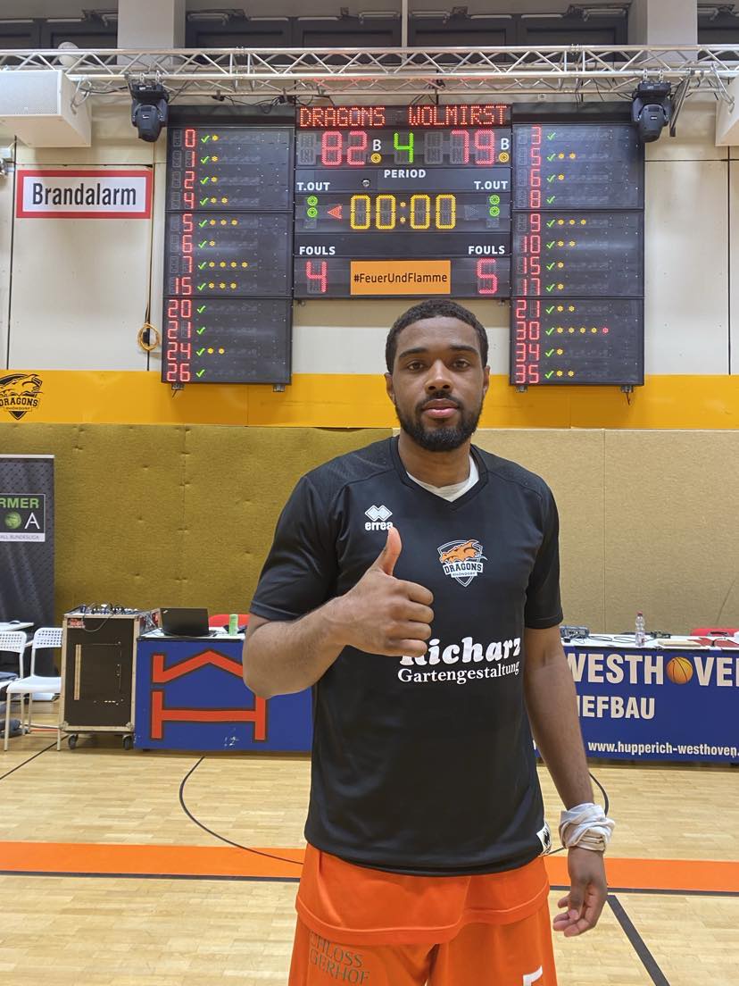 In the third quarter the Dragons Rhondorf continued to have the lead and every time they made a little push, the guests were able to come back and only trail by a little margin. Rhondorf got good support early from Badu Buck who drained a three pointer and made a lay in. Rhondorf had done a good job not overdoing it with the three point shooting, but really selecting good three point opportunities. The guests stayed with the Dragons getting a timely trey from Onwuka and a lay in by Borekambi to trail 53-51. Marko Rosic was inserted and gave instant energy with a three pointer and lay in for the 58-51 lead. Rhondorf held the lead, but could never break away as ex BBL player Martin Bogdanov and Winter scored as the Dragons only led 60-57. The guests had some real misfortune when Diamond Umwuka got hos finger balled out. He had to leave the game. Young German center Fabien Kondo scored back to back baskets as did Tyreese Blunt (191-PG-2002) as the Dragons Rhondorf had the slim 67-61 advantage after 3 quarters. “When Umwuka went down, we huddled together. We knew that they would come back aggressive. We locked down on defense and didn´t let them punch us back in the mouth. Marko Rosic gave us needed energy and was just fearless”, stressed Avery Sullivan. “We couldn´t get over the hump. I thought that we played pretty good 1-1 defense”, stated Chris Rollins. The Dragons Rhondorf shot 56% from the field and 40% from the three point line and had 20 rebounds and 13 turnovers while the SBB Baskets Wolmirstedt shot 49% from the field and 50% from the three point line and had 29 rebounds and 16 turnovers.