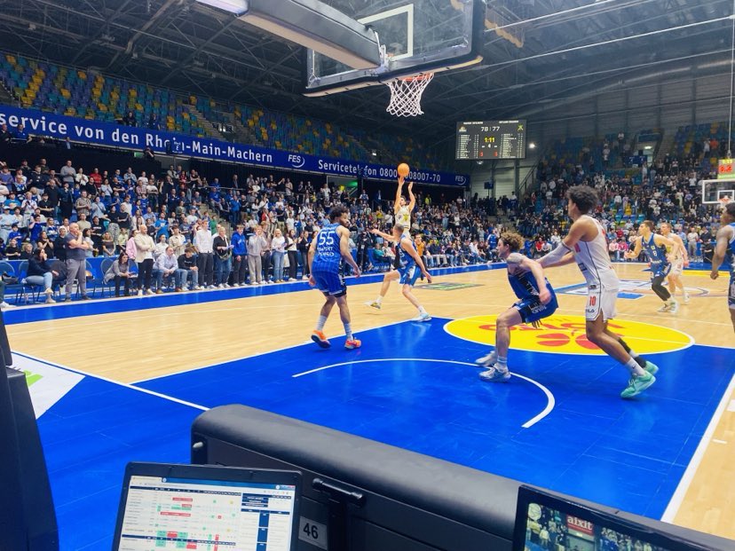 3,400 fans arrived in the Skyliners living room with also quite a few Dragons fans from Quackenbruck. The Fraport Skyliners came out with massive intensity at both ends taking the 6-2 lead. Canadian David Muenkat and German Jacob Knauf led the charge with dunks and Canadian Aiden Warnholtz scored on transition. That basketball is a game of runs is no secret as Artland struck back with a 9-2 run as they got good energy from 17 year veteran Brandon Thomas with 5 points while ex Temple (NCAA) center Jake Forrester made a dunk and Tennessee native Anthony Watkins made a 20 footer for the 11-9 lead. Frankfurt came back with great energy from the bench from Bruno Vrcic as he scored 5 points including a trey and Knauf continued to get great position finishing another dunk for the 19-15 lead. Frankfurt had a good rhythm on offense and got another three pointer this time from German Jordan Samare while Ajayi made a lay in for the 24-21 lead. Cam Henry was spectacular in this phase making a monster block and steal and setting up Ajayi on his score with the perfect lob pass. However Frankfurt couldn´t keep the momentum as Artland closed out the first quarter with a 4-0 run. The Dragons bigs Aaron Kayser and Forester made easy baskets as Frankfurt had massive problems keeping the zone closed off as Frankfurt had the tight 24-21 lead. The Fraport Skyliners shotb67% from the field and 67% from outside and had 6 rebounds and 4 turnovers while the Artland Dragons shot 63% from the field and 25% from outside and had 6 rebounds and 3 turnovers.