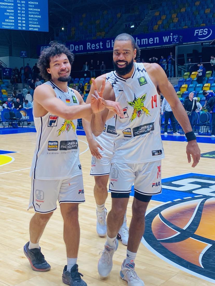 For some teams the last game day of the regular season is that last opportunity to go out in style as usually it means nothing in the standings. However on the last game day in Frankfurt, the season stakes were massive for both the Fraport Skyliners and Artland Dragons. They were fighting for the second spot with Giessen while the Artland Dragons thanks to a good ending spurt where they had played above 500 for 2 months had a chance to stay in the league. For both teams the outcome was massive, but obviously greater for the Artland Dragons. A little extra treat on the side was that Skyliner fans could witness one of the last great dinos from the easyCredit BBL Brandon Thomas (198-SF-1984, college: UMass, agency: Interperformances) play again as he was only a few months shy of his 40th birthday. One never knows how long guys like that will play again. On a rather cool late April spring day Brandon Thomas strolled into the Skyliners living room and literally left everything on the floor leading the Artland Dragons to the incredible 95-91 OT win keeping the Artland Dragons in the Pro A. It was a battle for 45 minutes where at the end it came down to a last shot that hot shooter Bruno Vrcic missed. “This game was tiring and it was a hard fought game where both teams wanted to win badly. I´m so proud of how the team played. Nobody gave up. It was very tough coming into here playing the second best team to stay in the league. Nobody expected it. I will never forget this game”, warned Artland Dragon Brandon Thomas. For the Fraport Skyliners, the absolutely worst happened as they fell from second place to fourth place in the standing and have a date with Jena and possibly Trier waiting in the semi finals. This loss could be a sour memory in a few weeks for the team. “We weren´t able to keep up the intensity on the boards. We gave up too many easy baskets and allowed Brandon Thomas to get hot which carried over to the team. We also let their bigs dominate”, stressed Fraport Skyliner center Ife Ajayi.