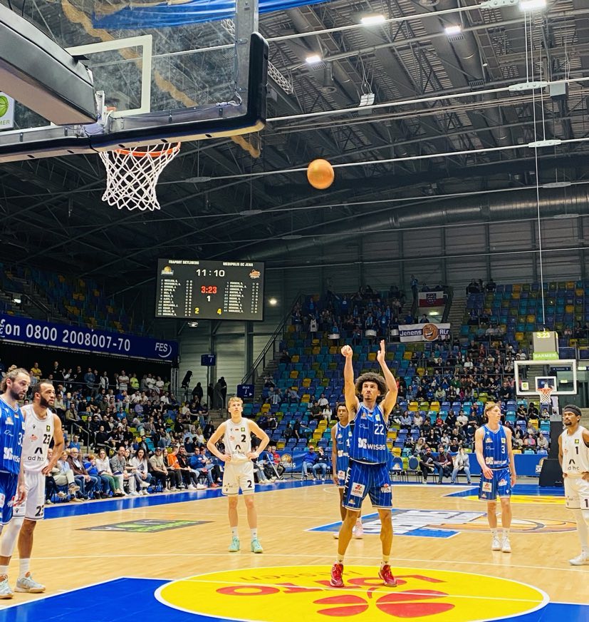 3,050 people were in the Skyliners living room and observed a very hard fought first quarter as no team led by more than 6 points. Both teams found to their rhythm quickly whereas Jena was playing very physical and got going by ex Skyliner Rasheed Moore who scored twice and always seems to be playing with a chip on his shoulder against his old team. The Fraport Skyliners did a super job moving the ball and finding the cutters and extra passes for easy hoops inside as German Justin Onyejiaka made the dunk from the extra pass by Booker Coplin and Coplin made the lay in with the extra pass by David Muenkat. Ex Schwenningen center Jacob Knauf also got hot scoring twice including an old school hook shot, but the game was tied 8-8. The three´s weren´t falling well for both teams, so boht concentrated trading buckets inside. Haukohl and Colorado native Alex Herrera scored inside while Frankfurt got to the free throw line well. Frankfurt was defending aggressively and forced Jena to 6 turnovers, but couldn´t profit too much leading 18-16 after 10 minutes. California native Ife Ajayi scored a floater to close out the first quarter. “It was important for us too stay patient early. We didn´t want to do too much and just stick to the game plan. They are a talented team and we were focused to try to wear them down”, stated Minnesota native Booker Coplin. The Fraport Skyliners shot 38% from the field and 20% from outside and had 7 rebounds and 1 turnover while Medipolis SC Jena shot 58% form the field and 0% from outside and had 7 rebounds.