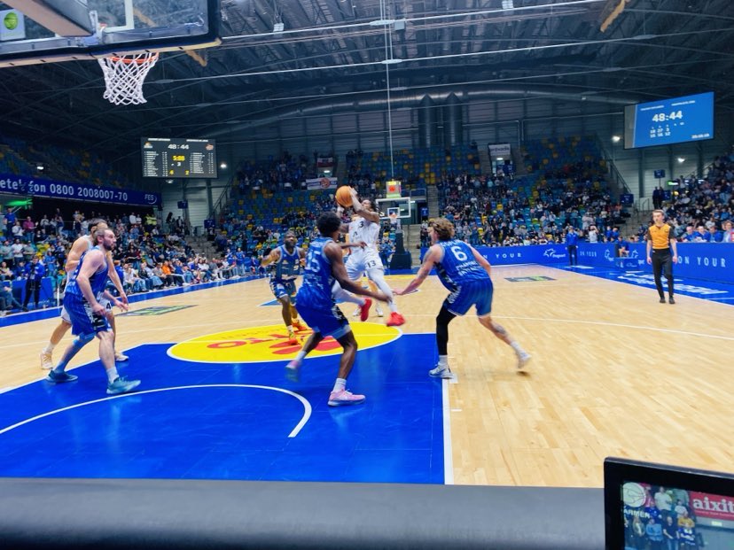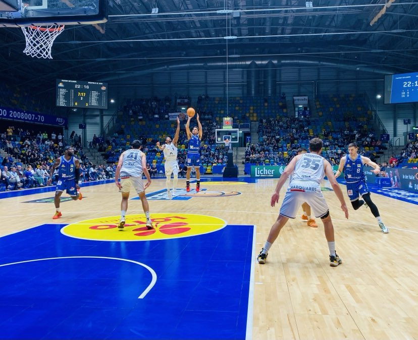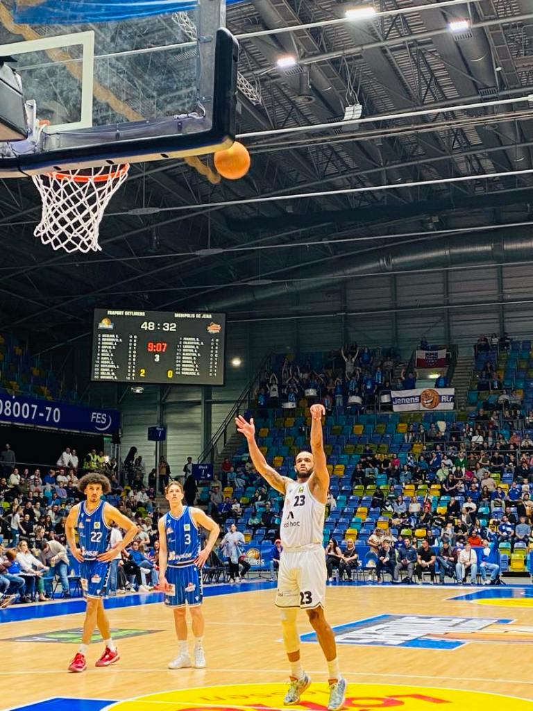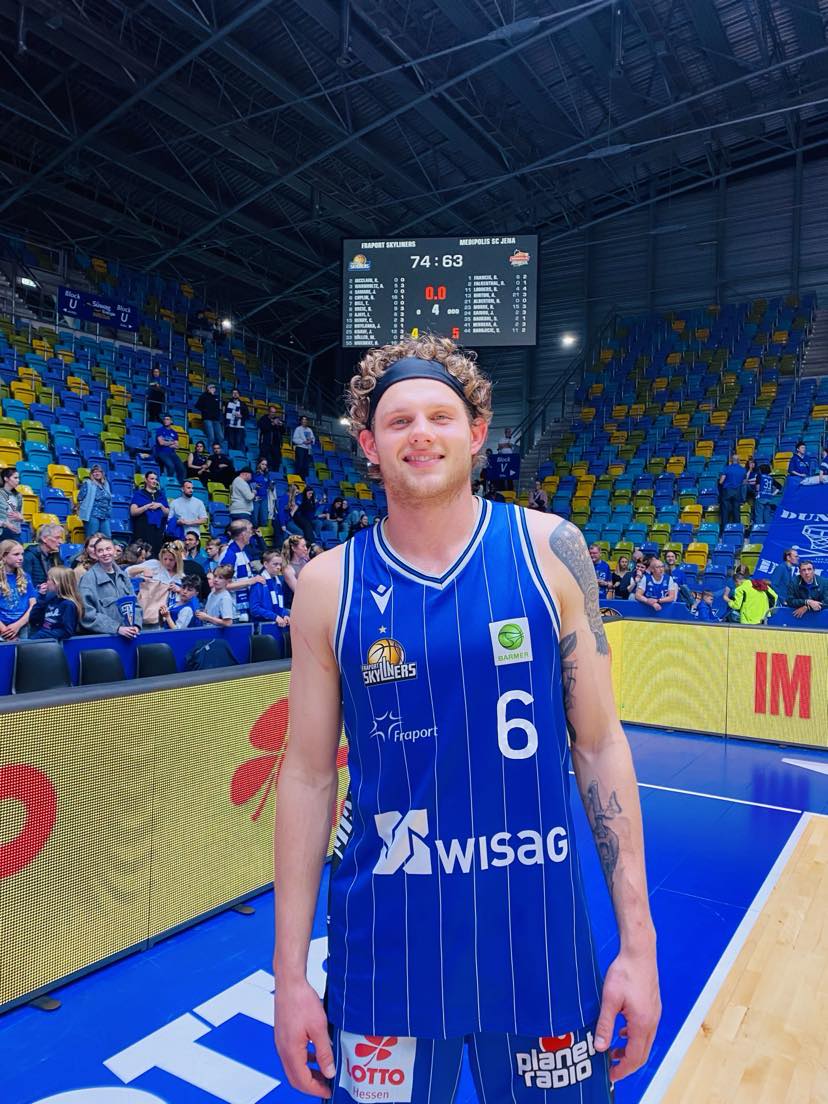 How often does one hear those famous words in sports with “what could have been”. The Fraport Skyliners had game 2 in their hands with 20 seconds to go and the last shot, but couldn´t execute as ex Carleton guard Aiden Warnholtz missed. Frankfurt could of wrapped up the series against Jena tonight, but instead entered the game with the series tied at 1-1. Frankfurt should of won game 2, but also had problems with foul management allowing Jena 35 free throw attempts. In game 3, there was a new dimension in the series as whoever won game 3 would have a match ball in Jena on Friday night. Both teams had a few days to watch film and make the needed adjustments as game 3 shifted back to Frankfurt and this time the Fraport Skyliners stepped up their defense to another level and fans witnessed the Coplin and Muenkat show as they nailed the big shots whenever the team needed it winning 74-63 over Jena and 2-1 series lead. “It was huge for us to react the way we did tonight after allowing 35 free throws in game 2. We were physical, but at the same time kept our identity and played smart. We defended very well and often held them to low in the shot count. We were efficient on offense and our defense allowed us to have extra possessions with their 22 turnovers”, expressed Fraport Skyliners guard Booker Coplin (191-G-1997, college: Augsburg, agency: BIG). Medipolis SC Jena never had a consistent flow on offense as the Frankfurt aggressive defense forced them to more 1-1 play and to many turnovers which allowed Frankfurt to control the game for the most part. “If you have 22 turnovers and only 7 assists, then it will be difficult to win. We had difficultly getting open shots and took too many contested shots. Frankfurt did a good job getting open shots and Muenkat pushed them with his three´s. We just didn´t have enough to get over the hump”. Stressed Medipolis SC Jena forward Stephan Haukohl.