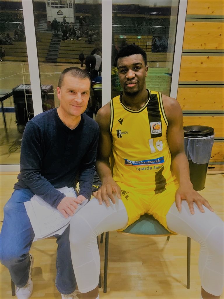 Miles Schmidt-Scheuber interviewing Ariel Hukporti after he dropped 19 points and grabbed 9 rebounds in a 76-61 win in Frankfurt in NBBL play in January 2020