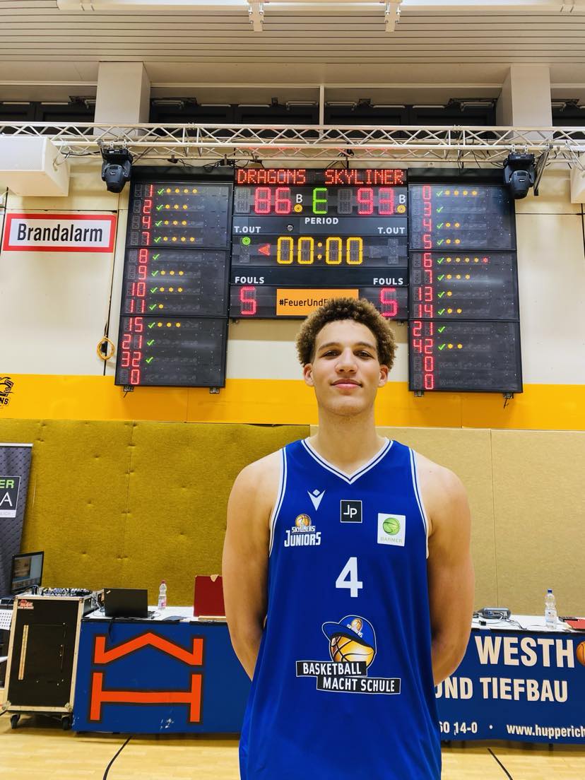 After a brutal 115-105 loss in Leitershofen, the Dragons Rhondorf were having serious soul searching and wondering how and when they could turn around their defensive woes in the Pro B? It was the clash of two 4-3 teams with the Dragons Rhondorf against the Frankfurt Skyliners Juniors. The Dragons Rhondorf may have a shaky defense, but their offense and three point shooting was incredible as they came in shooting 43% with 6 guys shooting over 40%. Frankfurt on the other hand also rely on their guard terror led by Bruno Albrecht and Felix Hecker and were shooting 38% as a team coming in. The Dragons Rhondorf needed a real strong week of practice especially on the defensive end as they had much to clean up. Rhondorf had another solid offensive performance, but missed golden opportunities late in the fourth quarter to seal the win, but instead came out flat in overtime to lose 93-86 to Frankfurt. “We had our ups and downs in the game. This was our second game in a row that we let out of our hands. We couldn´t get stops or score in crunch-time. Our biggest problems was rebounding and getting stops. We took good care of the ball. That was the only positive thing”, commented Dragons Rhondorf guard Alexander Lagermann. The Frankfurt Skyliners Juniors got good support from so many sides including a big man monster in Malick Kordel (211-C-2004) and the clutch performances of Jamie Edoka and Ivan Crnjac in the overtime that helped them get the win. “We played very well as a team. Even if we didn´t have Bruno Albrecht, we were very focused. Our bench was great and we played very physical. When they made runs, we didn´t sink our heads, but fought back. Our young guys played really well in overtime”, said Malick Kordel.