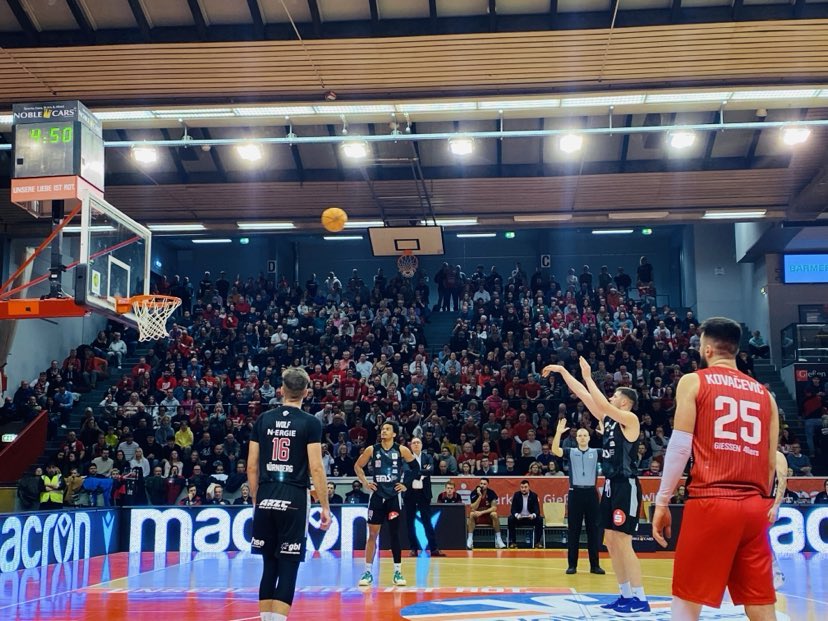 The Giessen 46ers didn´t waste anytime jumping over Nurnberg as they got a quick 7-2 advantage. They got their bigs involved right away as ex Nurnberg center Jonathan Maier scored as did Serbian forward Viktor Kovacevic. Nurnberg also fed it´s bigs as ex Koblenz center Leo Saffer scored and ex Giessen 46er guard Tim Koepple made a lay in and suddenly the guest were in striking range again trailing 10-7. Giessen showed that they can be explosive at anytime as they raced out on a 9-2 run to lead 19-9. In the run, Mcclain added 5 points and ex Xavier (NCAA) guard Kyle Castlin made a lay in and Kovacevic a fade away jumper. Giessn´s offense was rolling with good ball movement and good decisions while Nurnberg didn´t have good ball movement or spacing. American center Damian Forest who balled at North Alabama (NCAA) was aggressive making a basket and getting to the free throw line as Nurnberg was chipping away at Giessen´s lead and trailed only 24-17 after 10 minutes. “I was attacking from the start. I was just taking what the defense gave me. Whenever we saw mismatches, we took advantage of it”, stated Kevin McClain. Giessen was shooting 67& from the field and 25% from outside and had 9 rebounds and 0 turnovers while the Nurnberg Falcons BC shot 35% from the field and 0% from outside and had 10 rebounds and 2 turnovers.