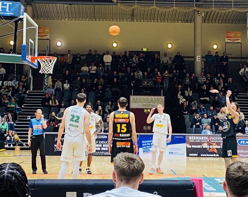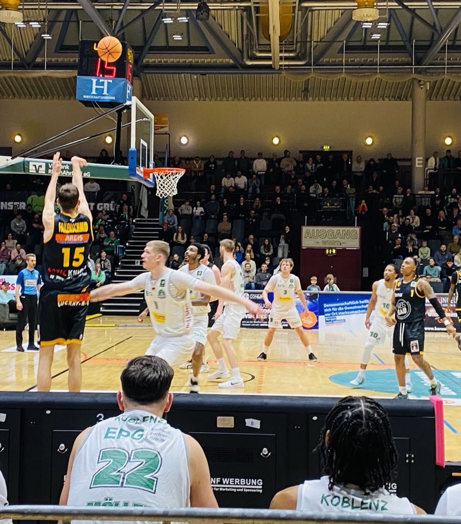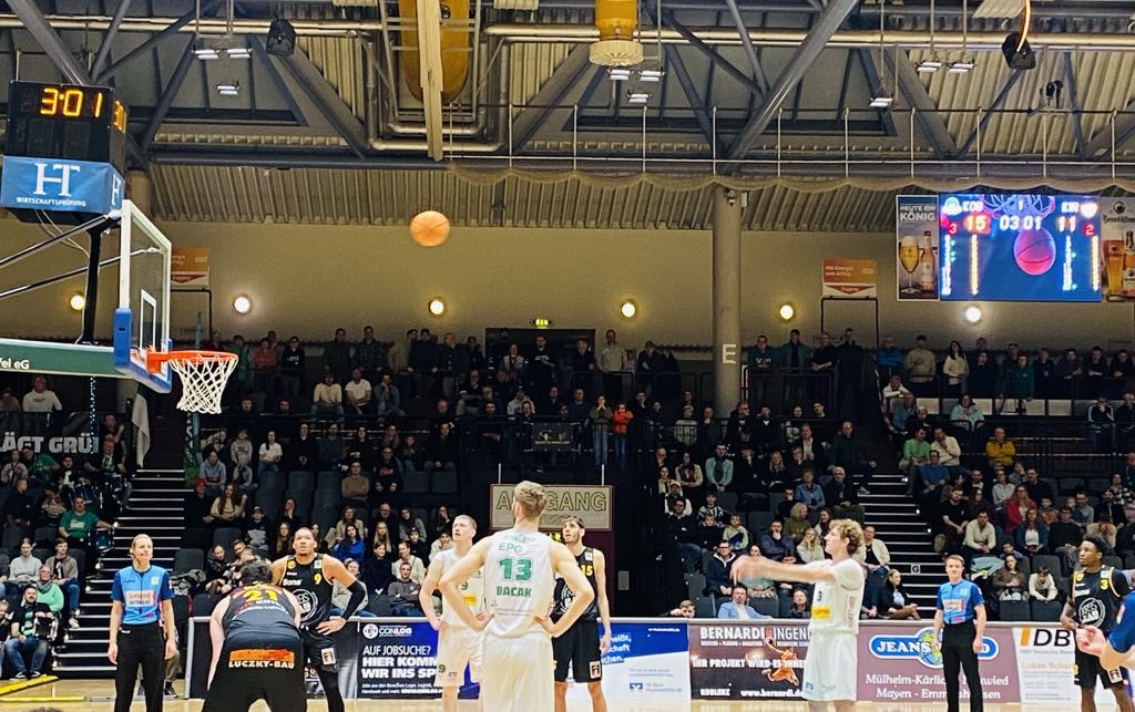 Basketball fans in general in Koblenz couldn´t have wished for a more exciting game to close out 2025 than the EPG Baskets battling Kirchheim. Only 7 weeks ago, both teams had begun slowly and had a combined record of 3-9 on November second. However since then both teams had experienced a special rebirth as the southern team from Kirchheim belonged to the hottest teams in the league having won 7 of their last 8 games while Koblenz also have slowly found out of their funk having won 5 of their last 8 games and in between had ridden a potent 4 game winning streak. Kirchheim was perched in seventh place with a 8-6 record while Koblenz was fighting to get in the top 8 playoff places having a 7-7 record and were in 11th place. Both teams wanted to close out 2025 with a bang and it was a game that was dominated for the most part by the EPG Baskets Koblenz, however they couldn´t finish the job as the Bozic Estriche Knights fought back forcing overtime and then had the killer instinct winning 105-98. Kircheim were powered by rookie Chuck Harris (188-G-2001, college: SMU) who supplied big shots all game long and then had the killer instinct making a big three supplying the last punch for the win. “We started off slow, but at the half-time talk, we stressed staying positive. We knew we could still make something happen in the second half. We stuck together as a team and always believed that we could win. We stayed disciplined and played with a lot of energy”, stressed Bozic Estriche Knights guard Chuck Harris. For the EPG Baskets Koblenz, it was their second bitter loss in a row as they continue to have difficulty closing out games. “We simply weren´t consistent enough. We had some good phases during the game, but we allowed them to come back twice. When your up by 16 points, you just can´t give it away the way we did”, stressed EPG Baskets Koblenz center Marko Bacak.