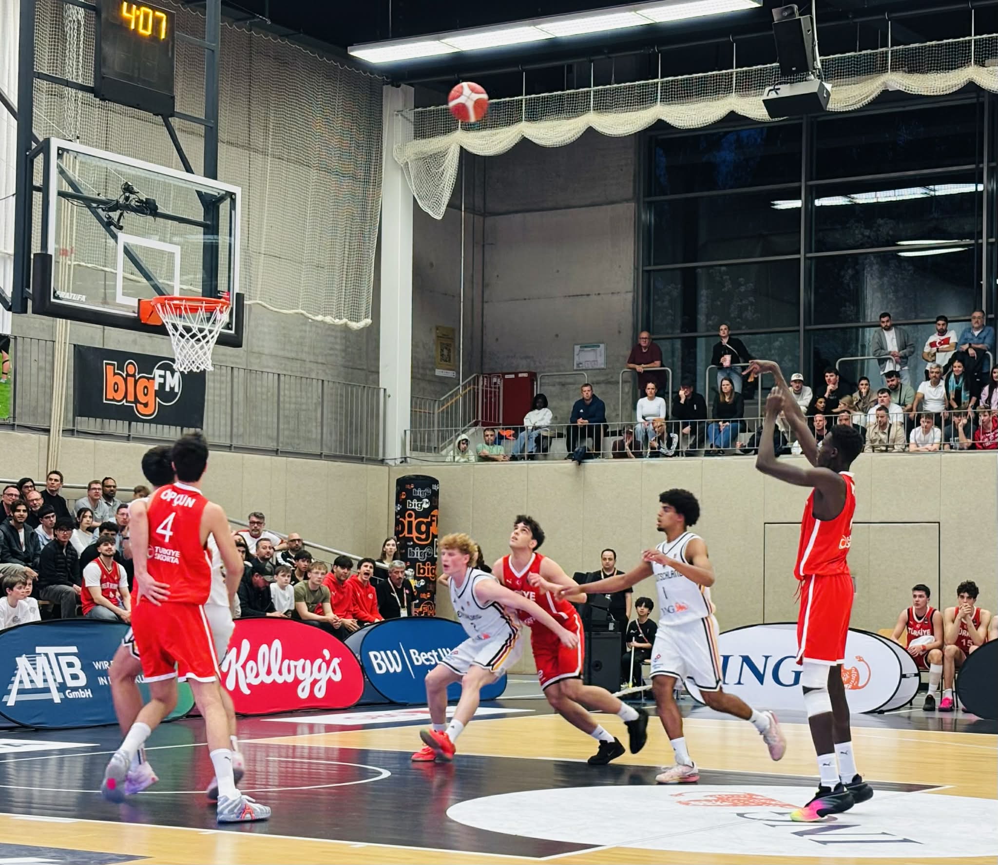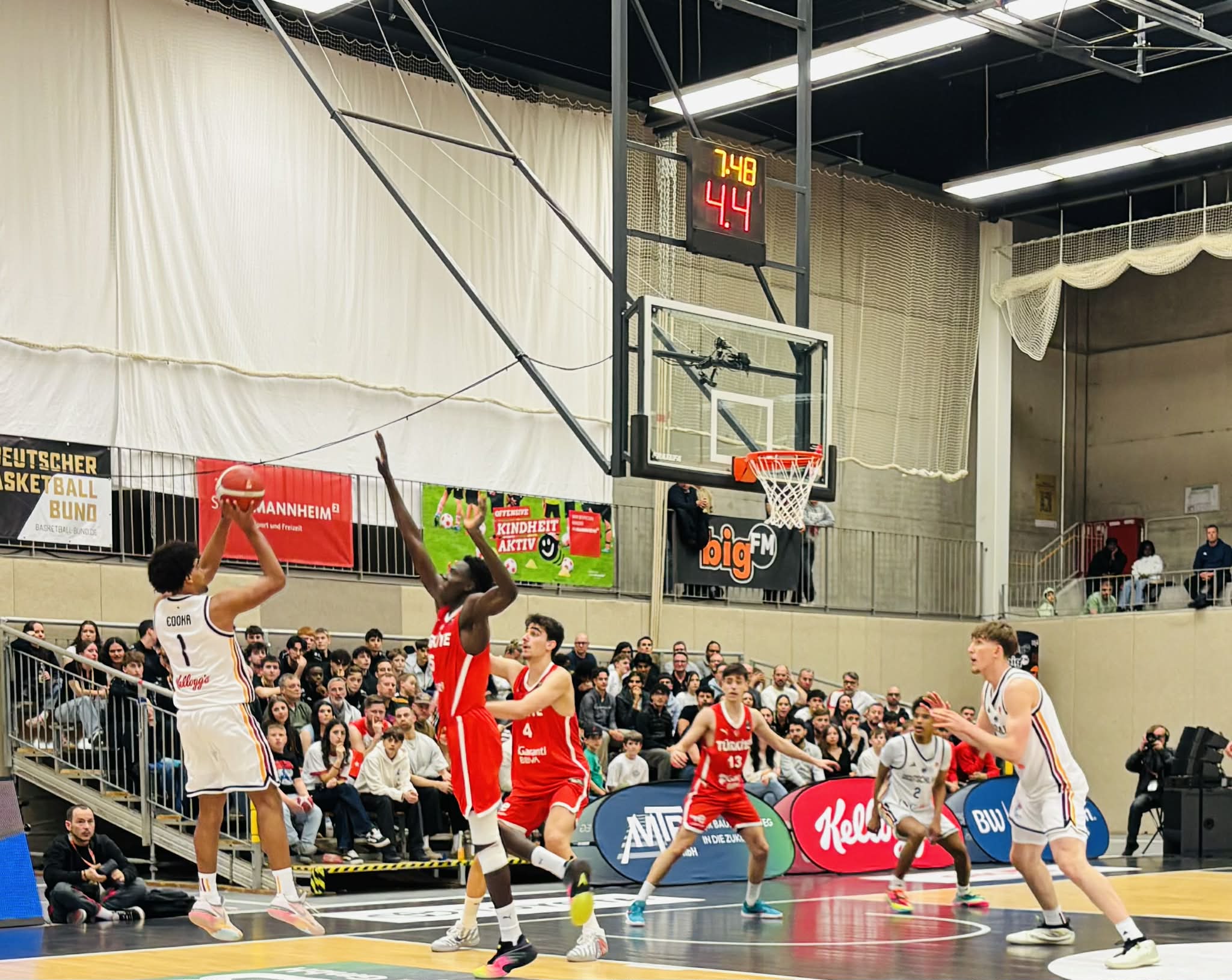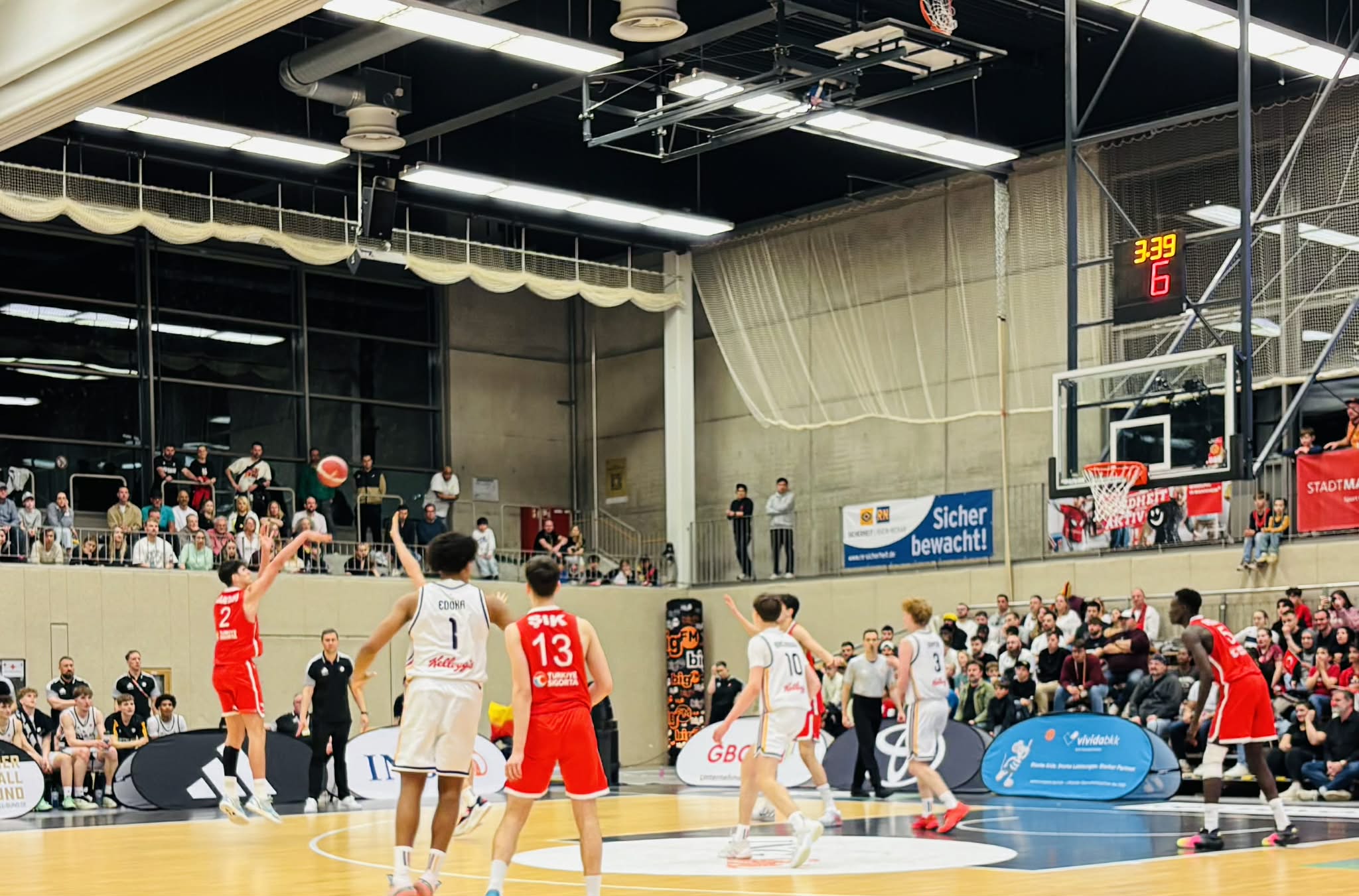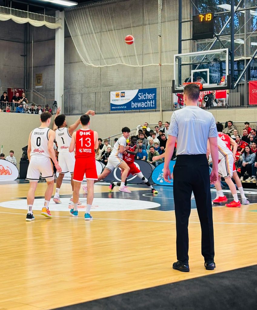 Turkey got off to a rapid start in front of nearly 2000 fans as the atmosphere was amazing leading 9-2 as they caught Germany on the wrong side of the bed again as had Slovenia. Perhaps Germany was a bit nervous, but in the first minutes they were unable to match Turkey´s physicality and intensity. Turkey attacked the rim and got 2 baskets from their best player Darius Karutasu while Sik also scored on the drive and Emre Yazinki who only started playing basketball a year ago nailed a jumper. Germany finally got into the game as their will to hustle came in to the game. Alba Berlin forward Fin Borczanowski made 2 big scores with an offensive rebound and put back and lay in on transition when Germany suddenly trailed only 9-7. Germany had raised their defensive intensity annoying Turkey and forcing them to a few turnovers. Turkey would hold the lead a while longer as Karutasu showed what a real work horse is when he scored over 3 Germans giving Turkey the 13-8 advantage. However Germany had a bench that gave great effort and was extremely vital in them closing out the first quarter with a 15-8 run to lead 24-20 after 10 minutes. Key in the run were a trey from Dragons Rhondorf guard Dusan Ilic and a massive dunk by Paderborn center Leonard Kroger and back to back baskets from Rasta Vechta guard Moritz Gruss. Germany not only had matched Turkey´s intensity and physicality, but had passed it. “Germany wasn´t consequent with their game in the first few minutes getting turnovers and trailing. But the bench gave great answers from Ilic and Dopfer. They made quicker decisions, increased the intensity and played as a team”, stated ex pro player Lotola Otshumbe. Germany shot 46% from the 2 point area and 33% from outside and had 9 rebounds and 3 turnovers while Turkey shot 63% from the field and 33% from outside and had 9 rebounds and 7 turnovers.