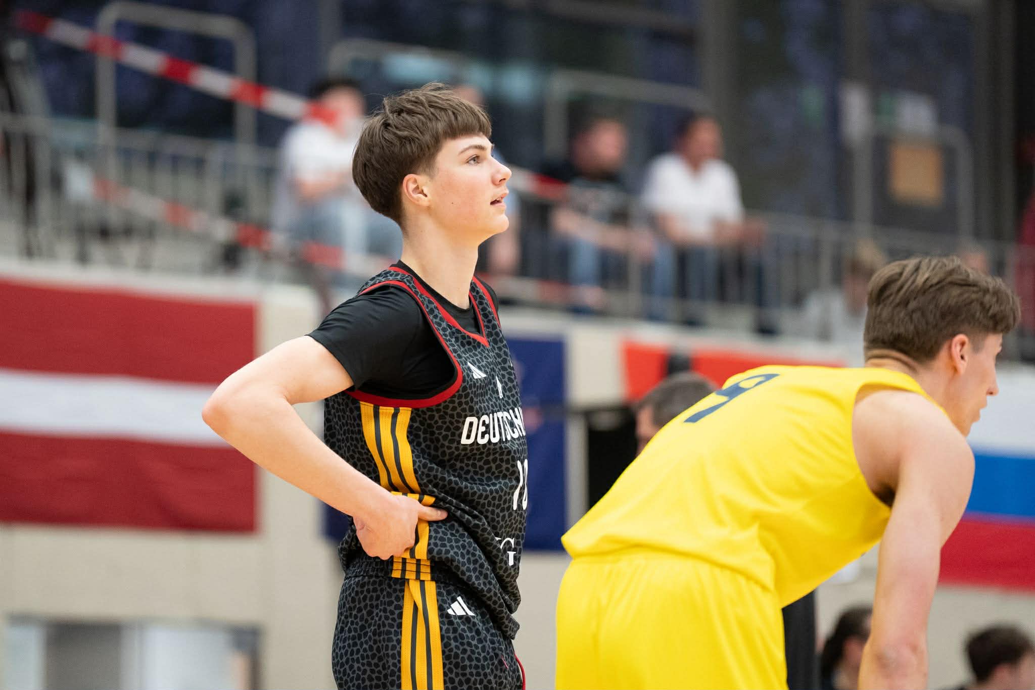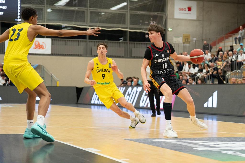 Germany played Bahrain first and used it as a warm up destroying the Asian team 116-59. Germany totally controlled the boards 55-31 and had 6 players score in double figures led by Lucai Anderson with 16 points. Having Bahrain first was good for us getting into the tournament. We could get used to everything especially ourselves with each other on the court. We also figured out what we also still needed to work on”, said Fin Borczanowski. Jamie Edoka had a solid first game scoring 11 points and filled the stat sheet and was on his way to becoming one of the best players in the tournament. “Jamie can simply do everything on the court. He did a really good job carrying the team through the tournament”, stated Fin Borczanowski. Germany next faced Slovenia and had their toughest challenge of the tournament. Germany started slow and had to play catch up basketball for most of the game. Germany picked up the intensity in the fourth quarter at both ends and won it with the masterful game winner by Jamie Edoka. “We learned that we had to have better starts in games. We needed to start with more energy. We also understood that if it is close, we can still stay with an opponent”, added Fin Borczanowski. Edoka closed out the game with a pretty step back jumper on the baseline where the basketball God let it bounce around on rim and back board before finally rolling in. “Jamie´s shot looked a bit long when he released it. I first didn´t think that it would go in, but was more so overjoyed when it did”, expressed Fin Borczanowski. Germany controlled the boards again 41-33 with 16 offensive rebounds and had 4 guys score in double figures. Lucai Anderson was top scorer with 16 points and nailed big three´s when Germany needed it in their come back. Caspar Vossenberg added 13 points and was one of those silent hero´s during the tournament stepping up in so many ways. “I feel like Caspar´s dunk were vital for our motivation. It helped us that we had a chance in games”, commented Fin Borczanowski. Germany next faced Turkey where many Turkish fans showed up adding to a beautiful atmosphere. Germany was in control in the first half, but had a horrible third quarter being outscored 24-4, but retreated in the fourth quarter demonstrating that they can flip the switch at any time exploding for 29 points and winning easily 95-80. “They were a year younger than us. They were physical and we had our problems with them at first. But when we began to run more and better, they couldn´t keep up with us”, said Fin Borczanowski. Germany once again dominated the boards 44-26 and offensive rebounds 20-8 and shot a potent 46% from outside. Germany was led by Lucai Anderson with 26 points and had 4 players in double figures. Anton Kemmer had a solid game of 11 points, but was in the shadow of Lucai Anderson´s brilliant scoring game. “ Anton is very versatile. He has the ability to hit three´s despite being very tall. His size also helped us immensely on the rebound and on defense”, added Fin Borczanowski.