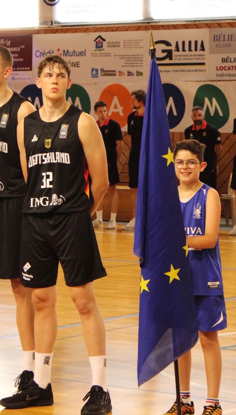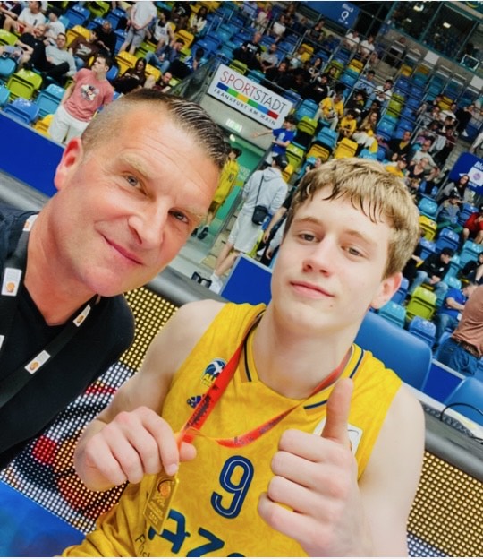 Miles Schmidt-Scheuber and Mathieu Grujicic after he led Alba Berlin to 2023 JBBL(U-16) title in Frankfurt, Germany